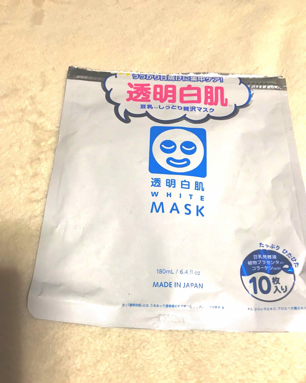 - <ホワイトマスクN> 水、グリセリン、BG、エタノール、ヒアルロン酸Na、加水分解コラーゲン、豆乳発酵液、クズ根エキス、クロレラエキス、アロエベラ葉エキス、ユキノシタエキス、ボタンエキス、ダイズ種子エキス、クエン酸、クエン酸Na、キサンタンガム、(スチレン/VP)コポリマー、ポリソルベート80、メチルパラベン、フェノキシエタノール