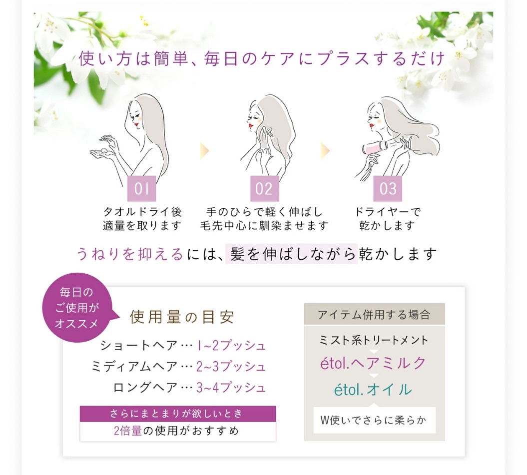 - ・【ゴワつき、うねり*ケア!】補修成分「トステア」を配合したヘアミルク! ・【こんなお悩みありませんか?】朝のスタイリングに時間がかかりすぎる、セットしてもすぐに髪が広がってしまう、髪がまとまらずに自信が持てない、髪が引っかかってブラッシングが大変、、、。そんな方におすすめです! *乾燥による