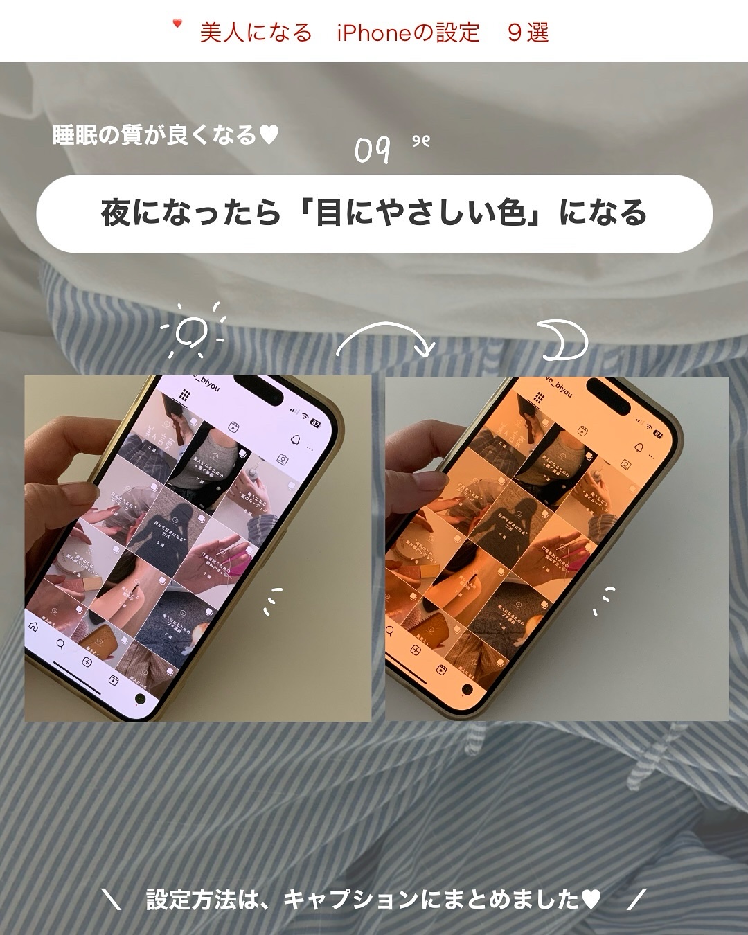 ブルーライトは目にも良くないし睡眠の質を下げると聞いたので私は目に優しい画面に設定しています❣️🌸