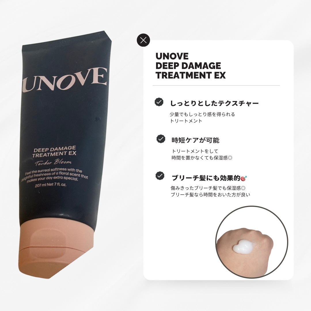 UNOVEディープダメージトリートメントEX大人気のリピーター続出トリートメント✨私もこのトリートメントは大好きで、何度も使ってる💙商品の特徴として、ケラチンーPFが30,000ppm配合されていて、髪の毛を素早く補修してくれるんだって。パー...