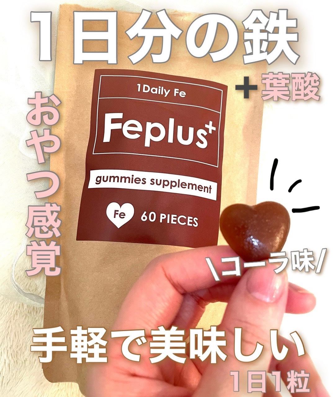 鉄分摂れるグミサプリ🤎鎌倉ライフのFeplus(エフイープラス)コーラ味60粒(2ヶ月分)ハート型のかわいいグミですが、これ1粒で1日分の鉄分が摂れるそう。鉄7.0mg葉酸200μgフレーバーは他にもブルーベリー味があります。食べや...