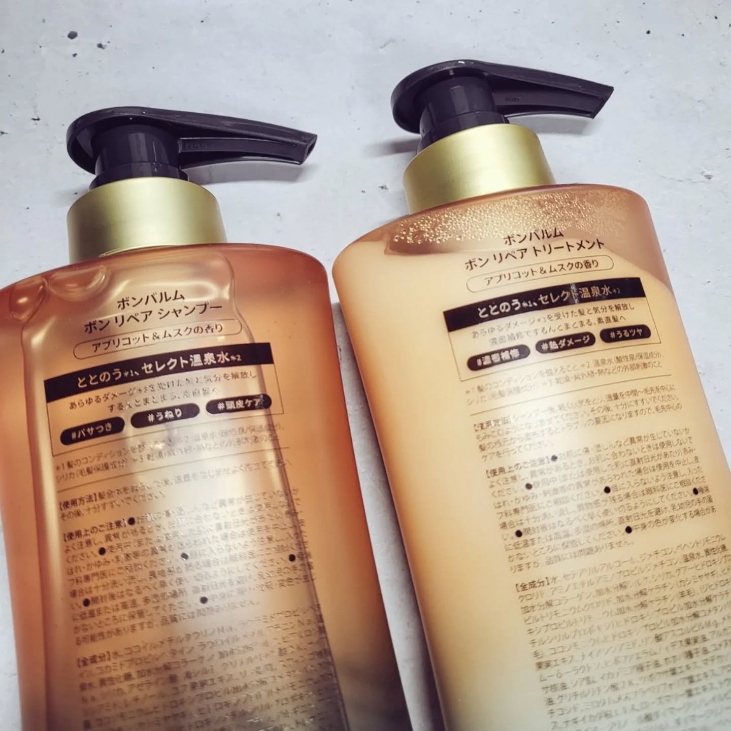 - <ボンリペアシャンプー/ボトル> 水、ココイルメチルタウリンNa、ラウラミドプロピルベタイン、コカミドプロピルベタイン、ラウロイルメチルアラニンNa、温泉水、異性化糖、加水分解コラーゲン、加水分解シルク、ヒアルロン酸Na、シリカ、アゼライン酸、海シルト、グリチルリチン酸2K、ナイアシンアミド、レチノール、ユズ果実エキス、リン脂質、スフィンゴ糖脂質、ココジモニウムヒドロキシプロピル加水分解コメタンパク、加水分解ケラチン(カシミヤヤギ)、ヒドロキシプロピルトリモニウム加水分解ケラチン(羊毛)、(ジヒドロキシメチルシリルプロポキシ)ヒドロキシプロピル加水分解ケラチン(羊毛)、ヘマチン、アルギニン、アスパラギン酸、グリシン、アラニン、セリン、バリン、プロリン、トレオニン、イソロイシン、ヒスチジン、フェニルアラニン、PCA、PCA-Na、ツボクサ葉エキス、マデカッソシド、アシアチコシド、ミロタムヌスフラベリフォリア葉エキス、アロエベラ葉エキス、リン酸アスコルビルMg、モモ葉エキス、カキ果実エキス、ローズマリー葉エキス、トウキンセンカ花エキス、メドウフォーム-δ-ラクトン、コレステロール、グルコシルルチン、リンゴ酸、クエン酸、クエン酸Na、乳酸Na、トリ(カプリル酸/カプリン酸)グリセリル、グリセリン、BG、プロパンジオール、ペンチレングリコール、ポリクオタニウム-10、グアーヒドロキシプロピルトリモニウムクロリド、ラウラミノプロピオン酸Na、コカミドメチルMEA、セテアレス-60ミリスチルグリコール、エタノール、EDTA-2Na、トコフェロール、フェノキシエタノール、安息香酸Na、硫酸亜鉛、BHT、塩化Na、香料 <ボンリペアトリートメント/ボトル> 水、セテアリルアルコール、ジメチコン、ベヘントリモニウムクロリド、アミノエチルアミノプロピルジメチコン、温泉水、異性化糖、加水分解コラーゲン、加水分解シルク、シリカ、グアーヒドロキシプロピルトリモニウムクロリド、加水分解ケラチン(カシミヤヤギ)、ヒドロキシプロピルトリモニウム加水分解ケラチン(羊毛)、(ジヒドロキシメチルシリルプロポキシ)ヒドロキシプロピル加水分解ケラチン(羊毛)、ココジモニウムヒドロキシプロピル加水分解コメタンパク、ユズ果実エキス、ナイアシンアミド、リン酸アスコルビルMg、メドウフォーム-δ-ラクトン、ヒポファエラムノイデス果実油、アルガニアスピノサ核油、シア脂、マカデミア種子油、ホホバ種子油、コメヌカ油、ヒマシ油、グリチルリチン酸2K、ツボクサ葉エキス、マデカッソシド、アシアチコシド、ミロタムヌスフラベリフォリア葉エキス、アロエベラ葉エキス、ナギイカダ根エキス、ローズマリー葉エキス、トウキンセンカ花エキス、ダイマージリノール酸ダイマージリノレイルビス(ベヘニル/イソステアリル/フィトステリル)、ダイマージリノール酸(フィトステリル/イソステアリル/セチル/ステアリル/ベヘニル)、ステアルトリモニウムクロリド、ラウラミノプロピオン酸Na、アミノプロピルジメチコン、アモジメチコン、プロパンジオール、ペンチレングリコール、イソプロパノール、BG、乳酸、クエン酸、クエン酸Na、トコフェロール、エタノール、フェノキシエタノール、安息香酸Na、香料 <ボンリペアシャンプー/リフィル> 水、ココイルメチルタウリンNa、ラウラミドプロピルベタイン、コカミドプロピルベタイン、ラウロイルメチルアラニンNa、温泉水、異性化糖、加水分解コラーゲン、加水分解シルク、ヒアルロン酸Na、シリカ、アゼライン酸、海シルト、グリチルリチン酸2K、ナイアシンアミド、レチノール、ユズ果実エキス、リン脂質、スフィンゴ糖脂質、ココジモニウムヒドロキシプロピル加水分解コメタンパク、加水分解ケラチン(カシミヤヤギ)、ヒドロキシプロピルトリモニウム加水分解ケラチン(羊毛)、(ジヒドロキシメチルシリルプロポキシ)ヒドロキシプロピル加水分解ケラチン(羊毛)、ヘマチン、アルギニン、アスパラギン酸、グリシン、アラニン、セリン、バリン、プロリン、トレオニン、イソロイシン、ヒスチジン、フェニルアラニン、PCA、PCA-Na、ツボクサ葉エキス、マデカッソシド、アシアチコシド、ミロタムヌスフラベリフォリア葉エキス、アロエベラ葉エキス、リン酸アスコルビルMg、モモ葉エキス、カキ果実エキス、ローズマリー葉エキス、トウキンセンカ花エキス、メドウフォーム-δ-ラクトン、コレステロール、グルコシルルチン、リンゴ酸、クエン酸、クエン酸Na、乳酸Na、トリ(カプリル酸/カプリン酸)グリセリル、グリセリン、BG、プロパンジオール、ペンチレングリコール、ポリクオタニウム-10、グアーヒドロキシプロピルトリモニウムクロリド、ラウラミノプロピオン酸Na、コカミドメチルMEA、セテアレス-60ミリスチルグリコール、エタノール、EDTA-2Na、トコフェロール、フェノキシエタノール、安息香酸Na、硫酸亜鉛、BHT、塩化Na、香料 <ボンリペアトリートメント/リフィル> 水、セテアリルアルコール