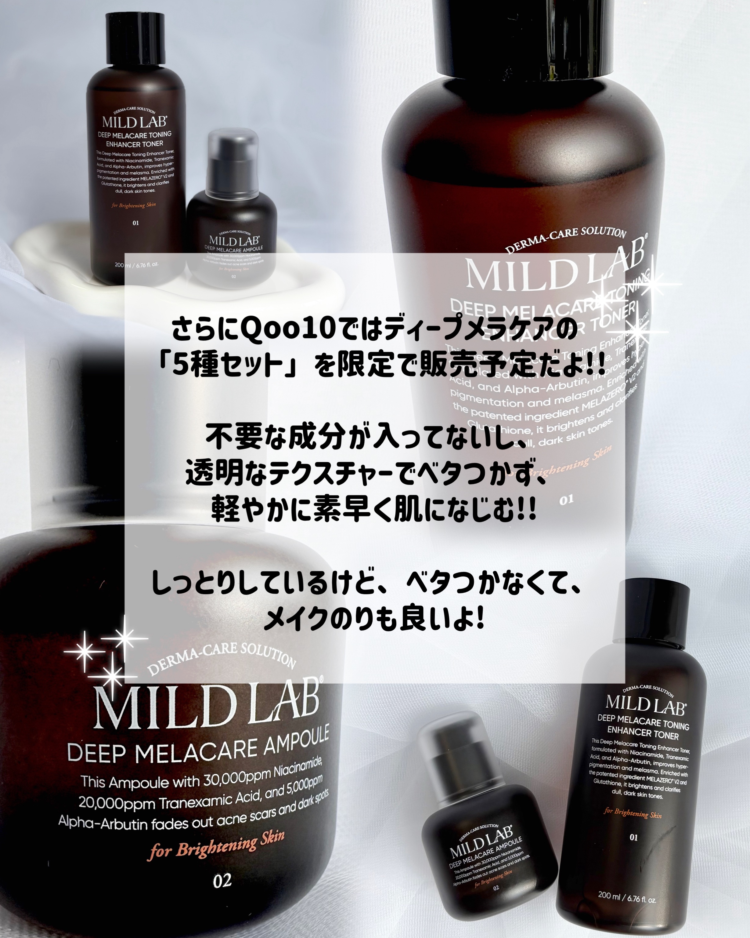 Mildlabさまからいただきました。Qoo10メガ割MILDLAB×コハルコラボセット発売🎊くすみや色素沈着にアプローチする、ディープメラケアライン3点▶︎ディープメラケアトーニングエンハンサー化粧水ナイアシンアミド、トラネキサム酸、α-ア...