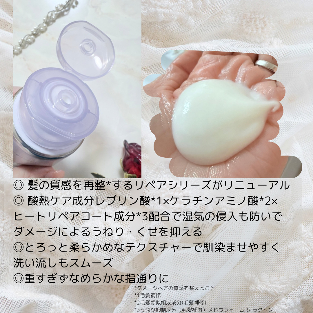 ルシードエルさまからいただきました。【アールイーリペアヘアマスク】✅2025/8/25にリニューアル発売サロン技術発想、毛髪補修成分※1最高濃度配合※2配合のヘアマスクです☑ドライヤー等による熱を与えることでヘアケア効果が促進され、毛先まで艶...