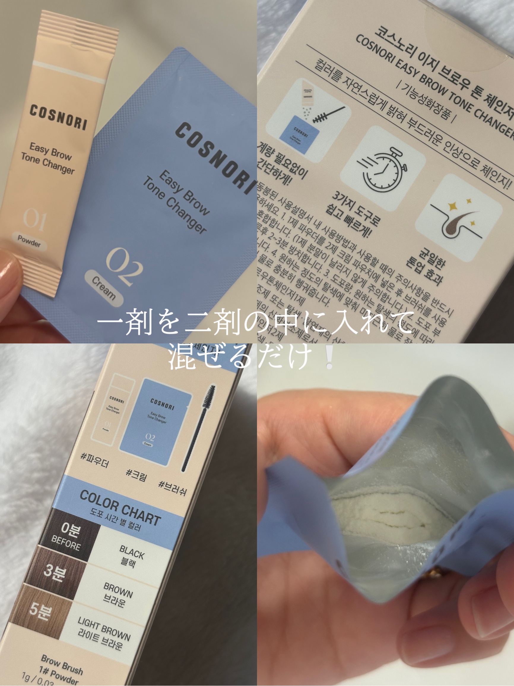 COSNORI“イージーブロウトーンチェンジャー”コスノリの眉ブリーチでセルフ眉ブリーチしてみました🥰私は明るくなり過ぎたくないので1分半。抜けるのがはやいので程よく抜けてナチュラルな抜け感のある眉になりました!5回分入ってます👍🏻ペプチド特...