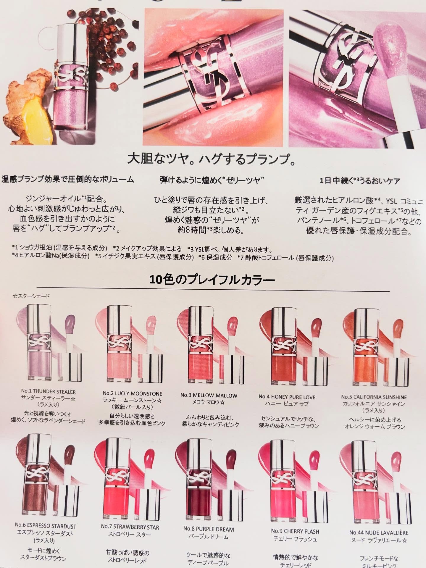 - YSL No.1(*1 ) リップ 「YSL ラブシャイン」シリーズから、待望のグロスプランパーが誕生。 ジンジャーオイル(*2)によるプランプ効果(*3)で、ぷっくりとしたボリュームある唇へ。 2025年7月5日(水) 公式オンライン ブティック/表参道フラッグシップ ブティック 先行発売 2025年7月11日(金) 全国発売 *1 2024年3月~2025年3月までの国内リップ販売数比較に基づく。YSL調べ。 *2 ショウガ根油(温感付与) *3 メイクアップ効果による