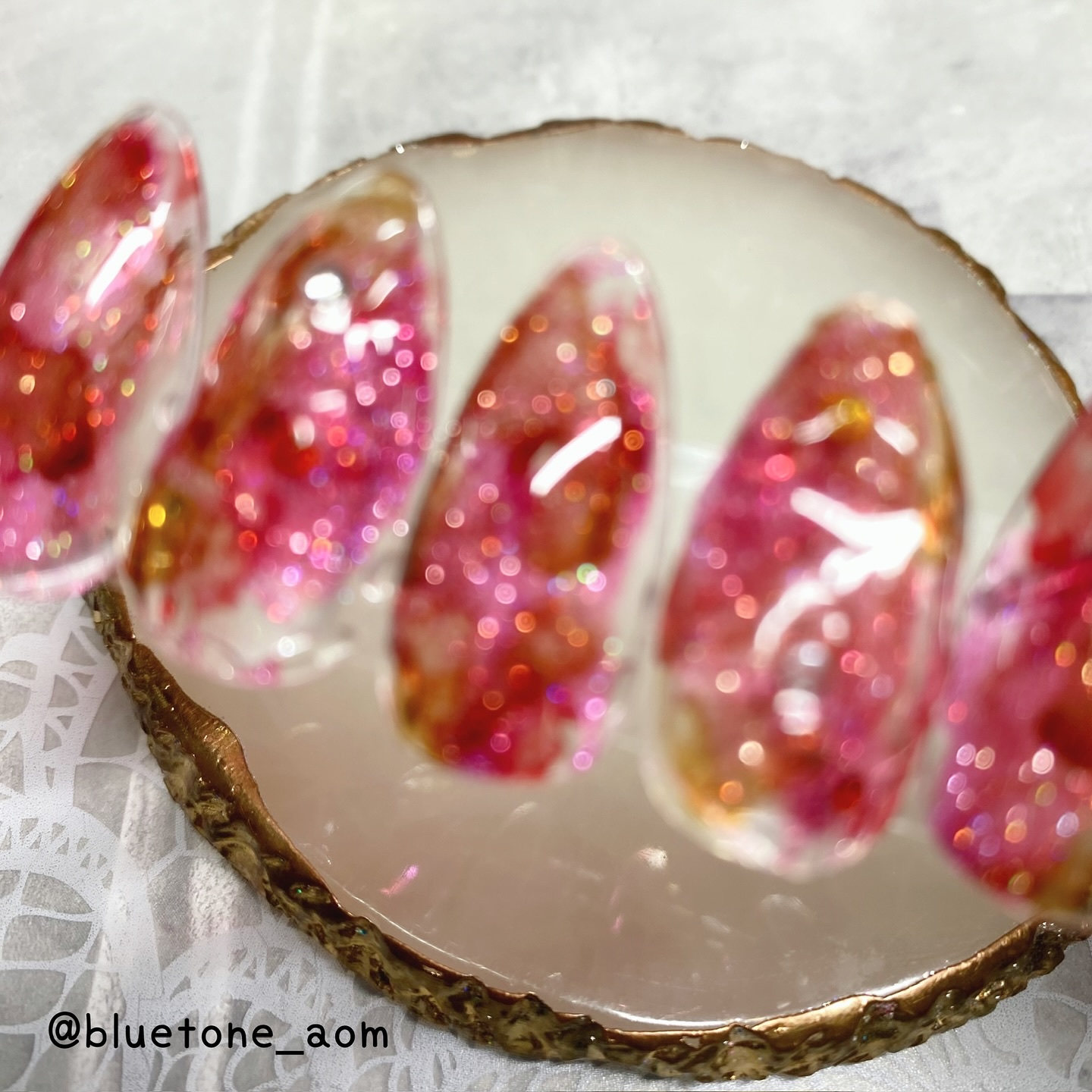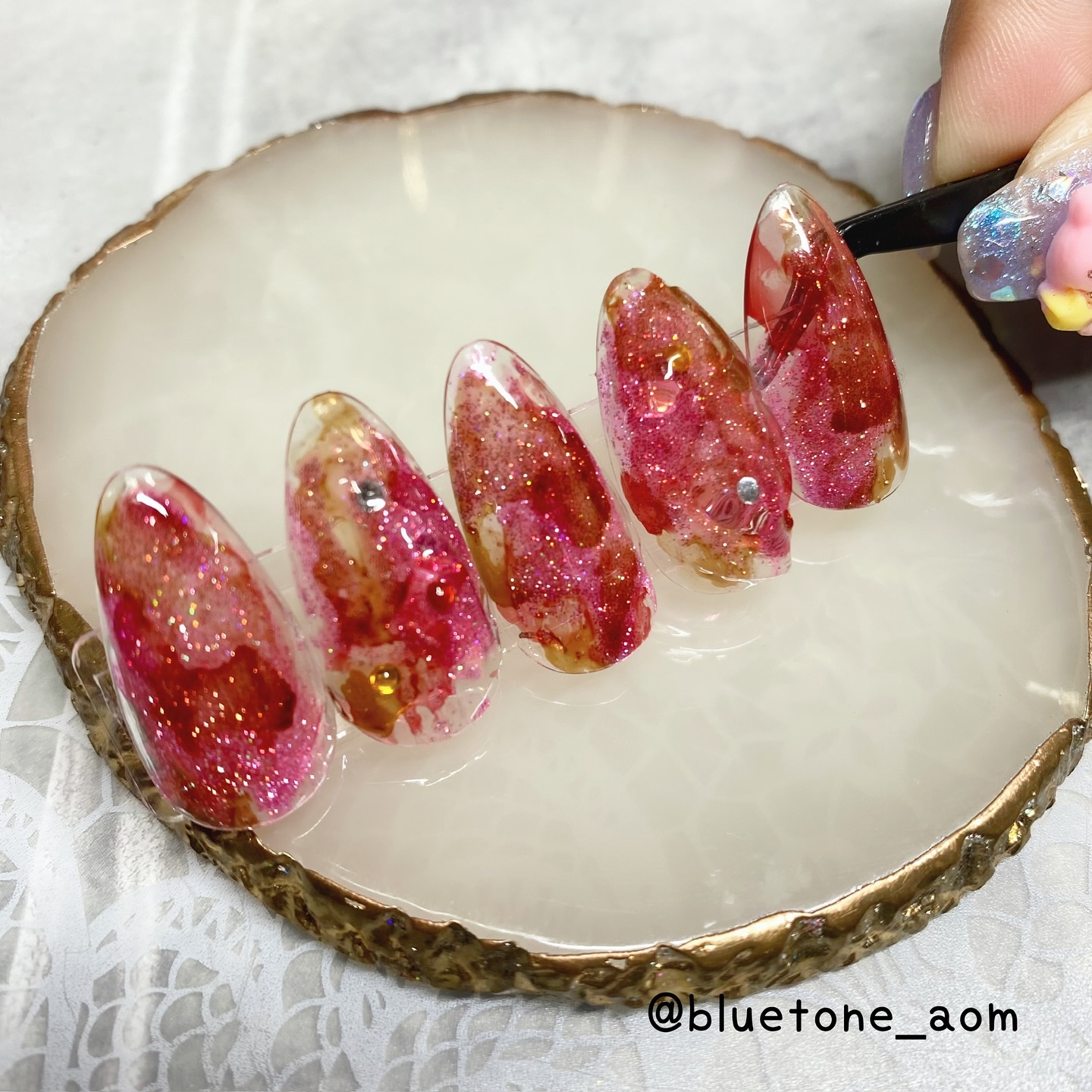 ラメがしっかりしてるし クリアカラーが入ってるから オーロラパウダー無しでも 充分キラキラしました! 反射強めのフィルムなので 実物はもっと うるうるとキラキラが強いです! ビー玉みたい🥺 ネイルシール長持ちさせたいけど ちょっと飽きてきたな〜って時とかに 全然違った印象になるのでオススメです! Seriaのベースジェル 本当にうるうるネイルしやすいので オススメしたい🙆♀️