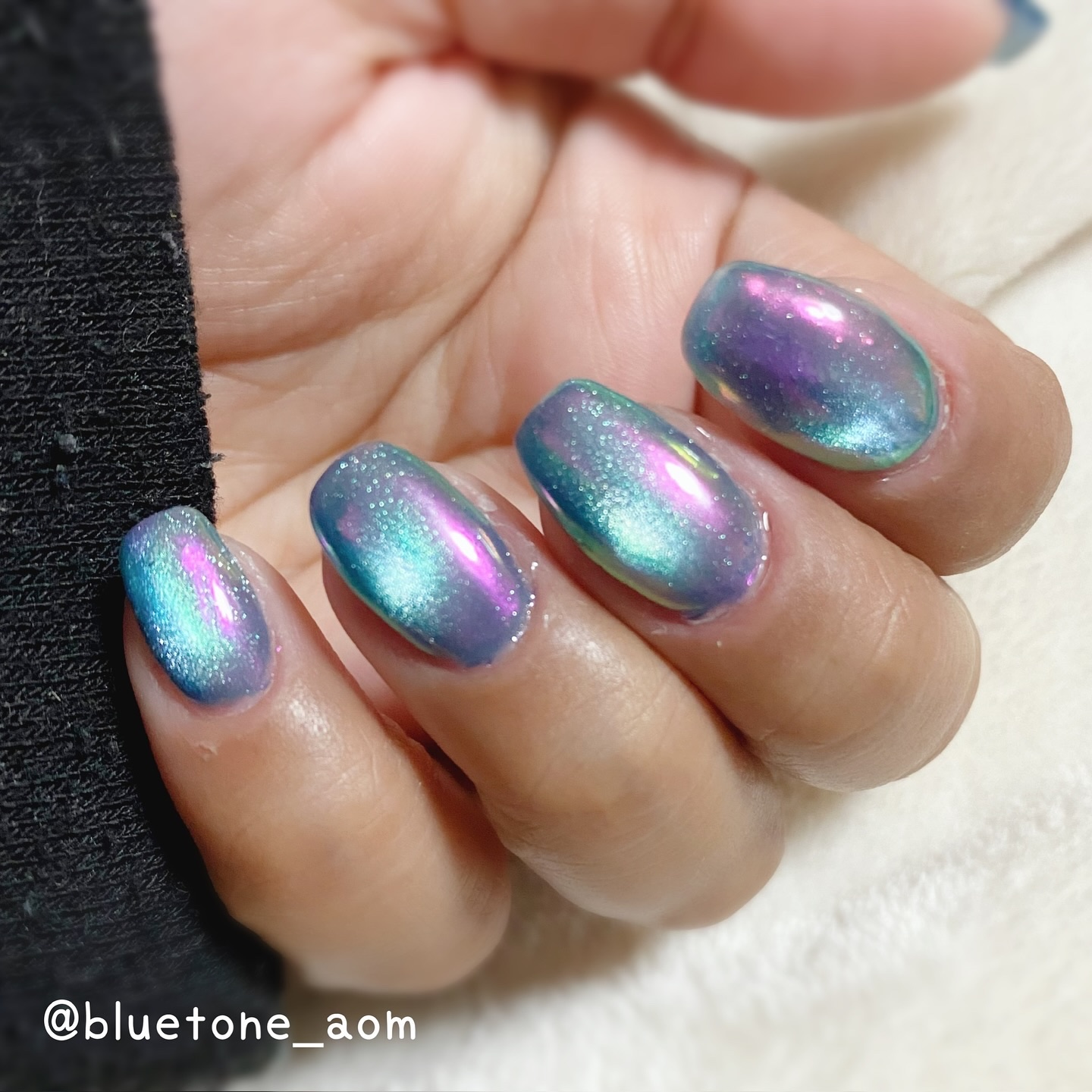 ラメがしっかりしてるし クリアカラーが入ってるから オーロラパウダー無しでも 充分キラキラしました! 反射強めのフィルムなので 実物はもっと うるうるとキラキラが強いです! ビー玉みたい🥺 ネイルシール長持ちさせたいけど ちょっと飽きてきたな〜って時とかに 全然違った印象になるのでオススメです! Seriaのベースジェル 本当にうるうるネイルしやすいので オススメしたい🙆♀️