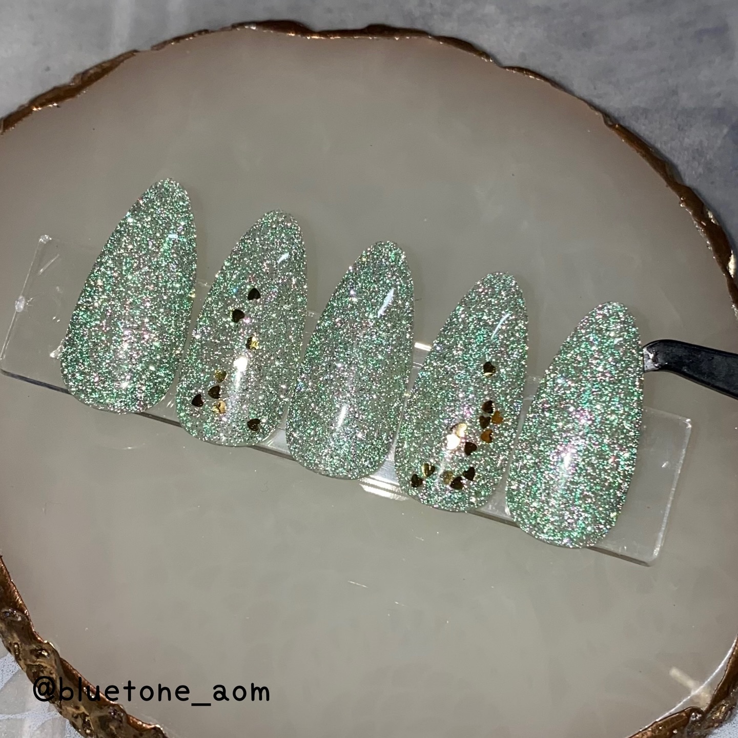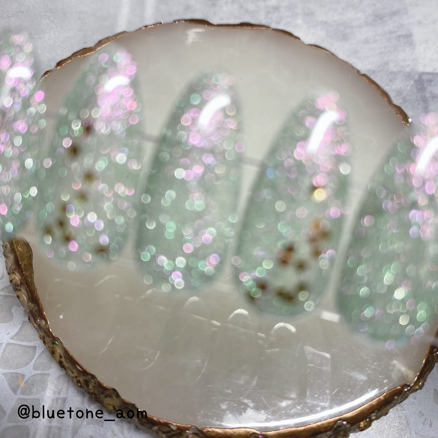 ラメがしっかりしてるし クリアカラーが入ってるから オーロラパウダー無しでも 充分キラキラしました! 反射強めのフィルムなので 実物はもっと うるうるとキラキラが強いです! ビー玉みたい🥺 ネイルシール長持ちさせたいけど ちょっと飽きてきたな〜って時とかに 全然違った印象になるのでオススメです! Seriaのベースジェル 本当にうるうるネイルしやすいので オススメしたい🙆♀️