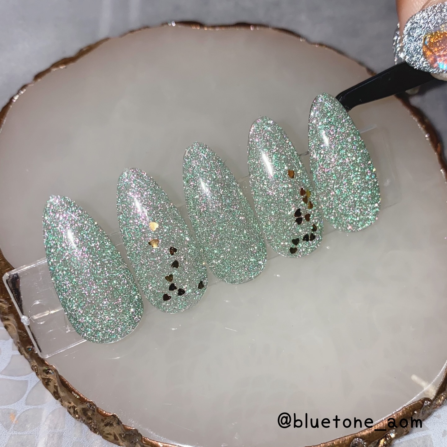 ベースカラーを塗ったらノンワイプトップを塗って硬化します。 クリア→ミラー感はあるけど、発色はそこまで濃くないのでガッツリシルバーを求めてる人は物足りないかも🤔 ホワイト→キレイにシルバーになりました! ミルキーホワイト→シャンパンゴールドみたいな落ち着いたゴールドっぽくなりました😳 ブラック→キレイにシルバーに!やっぱりブラックとシルバーは映えますね🤝ギラギラです! パウダーの粒子はちょっと大きめなのでちょっと不安でしたが擦ってみるとキレイにミラーになりました! ベースカラーで見え方も変わるので色々試しても面白いかもです🥰