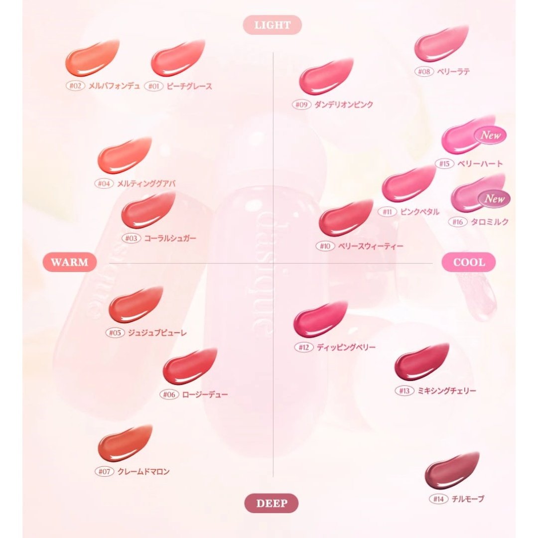 - 【夏新作2カラー登場!】 まるで果実のしずくがそのままリップになったような、みずみずしさと繊細なツヤを詰め込んだ「ジュージーデューイグロウティント」 夏新作で登場する新色「ベリーハート」、「タロミルク」は、透明感とふんわりとした色づきを徹底的にこだわって、何度もテストを重ねて生まれた特別なクールトーンカラー。 ひと塗りで唇をうるおし、重ねても重くならず、果実たっぷり!光をまとうような仕上がりに! - 蜂蜜に漬けた果物のように、うるちゅるふっくらとした果汁粘膜「ジューシーデュイグロウティント」 ミニだけの限定4色 15 ローストロベリー 16 ハミングピンク 17 ロージーシナモン 18 モーブディープス ♡唇に触れた途端、ぷるんと色っぽい果汁コーティング 果汁コーティングがじゅわっと唇に広がり、透明に輝くうるちゅる感を!蜂蜜に漬けた果物のようにぷるんぷるんとした唇を演出するグロウティント ♡イエベ、ブルべに合わせた多彩なカラーバリエーション 14色のカラーバリエーションで単独または、2色レイヤーリングして様々なリップメイクを演出 ♡ティント+リップグロスを一気に塗る効果! ティントの鮮やかな発色とリップグロスのうるうる透明ツヤ感が何度塗り重ねてもべたつかせず、唇にピタッと密着! 2025年11月1日(土)より、Qoo10公式ショップおよび東京フラッグシップストアにて発売予定