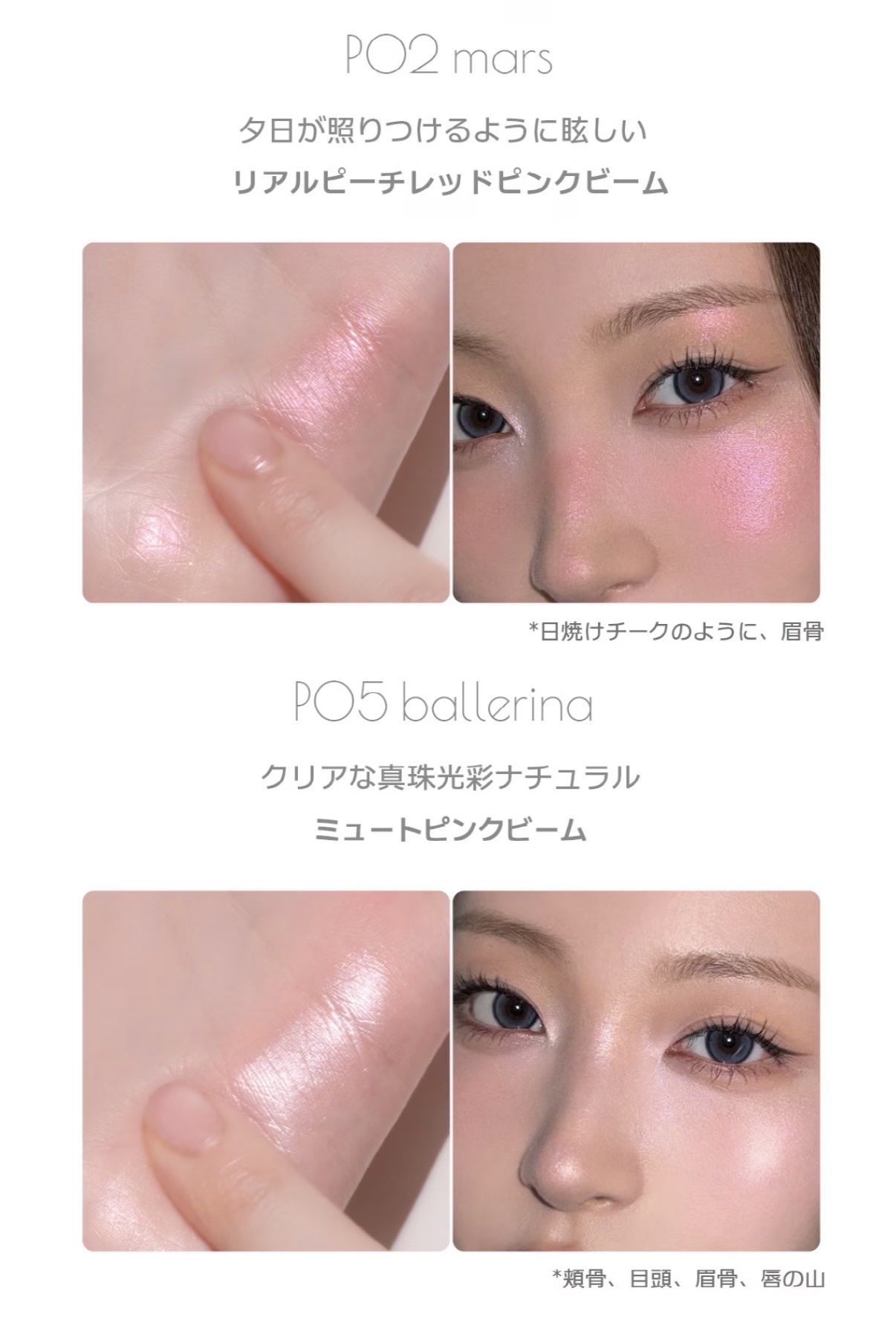 - <ツヤビームハイライト> 発光ビーム系ハイライトでまるでスポットライトが当たったようなツヤ感を演出。 繊細なパールが多幸感あふれる仕上がりを叶えます。 ハイライターとしてはもちろん、アイシャドウやチークにもオススメ。 <マットハイライト> 目的に合わせた2種のマットパウダーでまるでヴェールをかけたようなサテン肌に。 9月中旬より発売