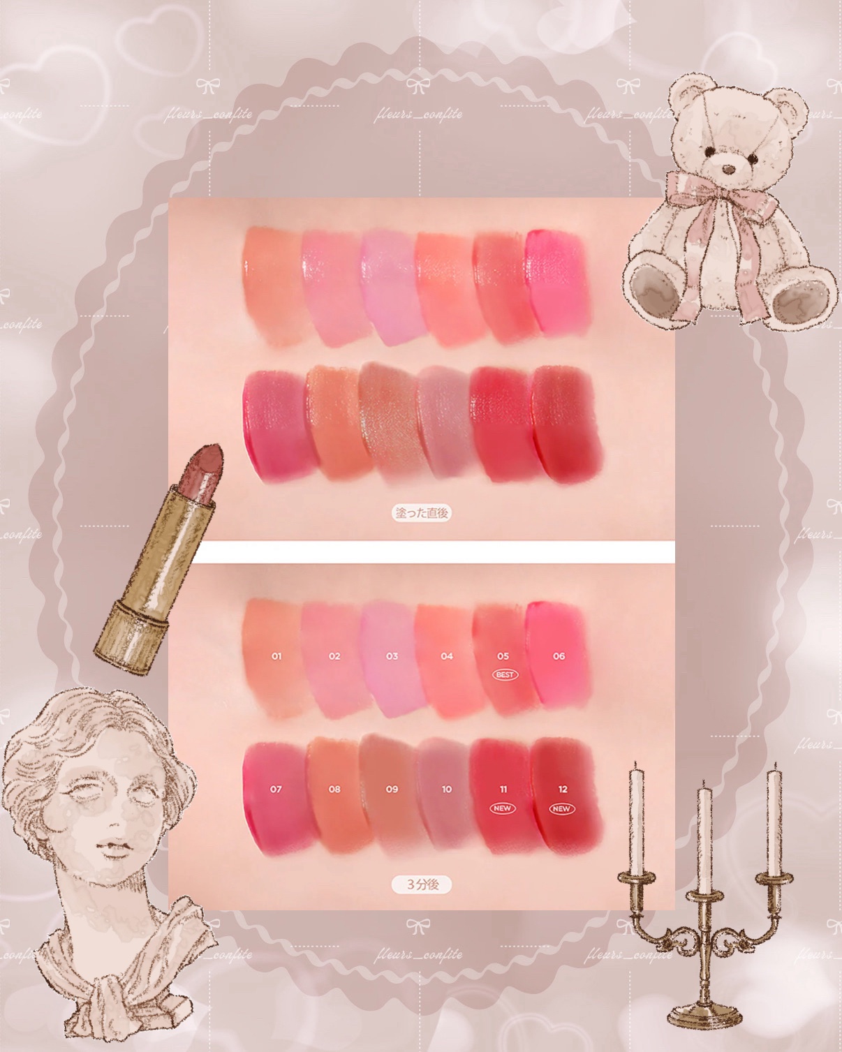 - <01 バニラビーンクリーム(Vanilla Bean Cream)> 水、ジメチコン、グリセリン、カプリリルメチコン(ジメチコン/ビニルジメチコン)クロスポリマー、ペンチレングリコール、ジメチ コンクロスポリマー、アクリレーツクロスポリマー-2-Na、1,2-ヘキサンジオール、セテアレス-20、セチルPEG/PPG-1 0/1ジメチコン、ミリスチン酸ポリグリセリル-10、BG、フェノキシエタノール、ステアリン酸グリセリル、ステアリン酸PEG-10 0、ジフェニルシロキシフェニルトリメチコン(アクリロイルジメチルタウリンアンモニウム/VP)コポリマー、香料、ポリアクリレート- 13、トリ(カプリル酸/カプリン酸)グリセリル、ポリイソブテン、エチルヘキシルグリセリン、エチレンジアミンジコハク酸3Na、水添レ シチン、水酸化Al、ポリソルベート20、ポリアクリル酸アンモニウム、イソステアリン酸ソルビタン、アルギニン、カルボマー、セラミドNP、酸化チタン、赤227、黄4、黄5、青1 <02 ローズカスタード(Rose Custard)> 水、ジメチコン、グリセリン、カプリリルメチコン(ジメチコン/ビニルジメチコン)クロスポリマー、ペンチレングリコール、ジメチ コンクロスポリマー、アクリレーツクロスポリマー-2-Na、1,2-ヘキサンジオール、セテアレス-20、セチルPEG/PPG-1 0/1ジメチコン、ミリスチン酸ポリグリセリル-10、BG、フェノキシエタノール、ステアリン酸グリセリル、ステアリン酸PEG-10 0、ジフェニルシロキシフェニルトリメチコン(アクリロイルジメチルタウリンアンモニウム/VP)コポリマー、香料、ポリアクリレート- 13、トリ(カプリル酸/カプリン酸)グリセリル、ポリイソブテン、エチルヘキシルグリセリン、エチレンジアミンジコハク酸3Na、水添レ シチン、ポリソルベート20、水酸化Al、ポリアクリル酸アンモニウム、イソステアリン酸ソルビタン、アルギニン、カルボマー、セラミドNP、酸化チタン、赤227、黄4、黄5、青1 <03 ストロベリーベビーシュー(Strawberry Baby Chou)> 水、ジメチコン、グリセリン、カプリリルメチコン(ジメチコン/ビニルジメチコン)クロスポリマー、ペンチレングリコール、ジメチ コンクロスポリマー、アクリレーツクロスポリマー-2-Na、1,2-ヘキサンジオール、セテアレス-20、セチルPEG/PPG-1 0/1ジメチコン、ミリスチン酸ポリグリセリル-10、BG、フェノキシエタノール、ステアリン酸グリセリル、ステアリン酸PEG-10 0、ジフェニルシロキシフェニルトリメチコン(アクリロイルジメチルタウリンアンモニウム/VP)コポリマー、香料、ポリアクリレート- 13、トリ(カプリル酸/カプリン酸)グリセリル、ポリイソブテン、エチルヘキシルグリセリン、エチレンジアミンジコハク酸3Na、水添レ シチン、ポリソルベート20、イソステアリン酸ソルビタン、アルギニン、カルボマー、水酸化Al、ポリアクリル酸アンモニウム、セラミドNP、酸化チタン、赤227、黄4、黄5、青1 <04 ピーチプディング(Peach Pudding)> 水、ジメチコン、グリセリン、カプリリルメチコン(ジメチコン/ビニルジメチコン)クロスポリマー、ペンチレングリコール、ジメチ コンクロスポリマー、アクリレーツクロスポリマー-2-Na、1,2-ヘキサンジオール、セテアレス-20、セチルPEG/PPG-1 0/1ジメチコン、ミリスチン酸ポリグリセリル-10、BG、フェノキシエタノール、ステアリン酸グリセリル、ステアリン酸PEG-10 0、ジフェニルシロキシフェニルトリメチコン(アクリロイルジメチルタウリンアンモニウム/VP)コポリマー、香料、ポリアクリレート- 13、トリ(カプリル酸/カプリン酸)グリセリル、ポリイソブテン、エチルヘキシルグリセリン、エチレンジアミンジコハク酸3Na、水添レ シチン、ポリソルベート20、イソステアリン酸ソルビタン、水酸化Al、アルギニン、カルボマー、ポリアクリル酸アンモニウム、セラミドNP、酸化チタン、赤104(1)、赤227、黄4、黄5 <05 ハニーグレープフルーツクレープ(Honey Grapefruit Crepe)> 水、ジメチコン、グリセリン、カプリリルメチコン(ジメチコン/ビニルジメチコン)クロスポリマー、ペンチレングリコール、ジメチ コンクロスポリマー、アクリレーツクロスポリマー-2-Na、1,2-ヘキサンジオール、セテアレス-20、セチルPEG/PPG-1 0/1ジメチコン、ミリスチン酸ポリグリセリル-10、BG、フェノキシエタノール、ステアリン酸グリセリル、ステアリン酸PEG-10 0、ジフェニルシロキシフェニルトリメチコン(アクリロイルジメチルタウリンアンモニウム/VP)コポリマー、香料、ポリアクリレート- 13、トリ(カプリル酸/カプリン酸)グリセリル、ポリイソブテン、エチルヘキシルグリセリン、エチレンジアミンジコハク酸3Na、水添レ シチン、ポリソルベート20、イソステアリン酸ソルビタン、アルギニン、カルボマー、セラミドNP、水酸化Al、ポリアクリル酸アンモニウム、酸化チタン、赤104(1)、赤227、黄4、黄5、青1 <06 チェリートッピング(Cherry Topping)> 水、ジメチコン、グリセリン、カプリリルメチコン(ジメチコン/ビニルジメチコン)クロスポリマー、ペンチレングリコール、ジメチ コンクロスポリマー、アクリレー