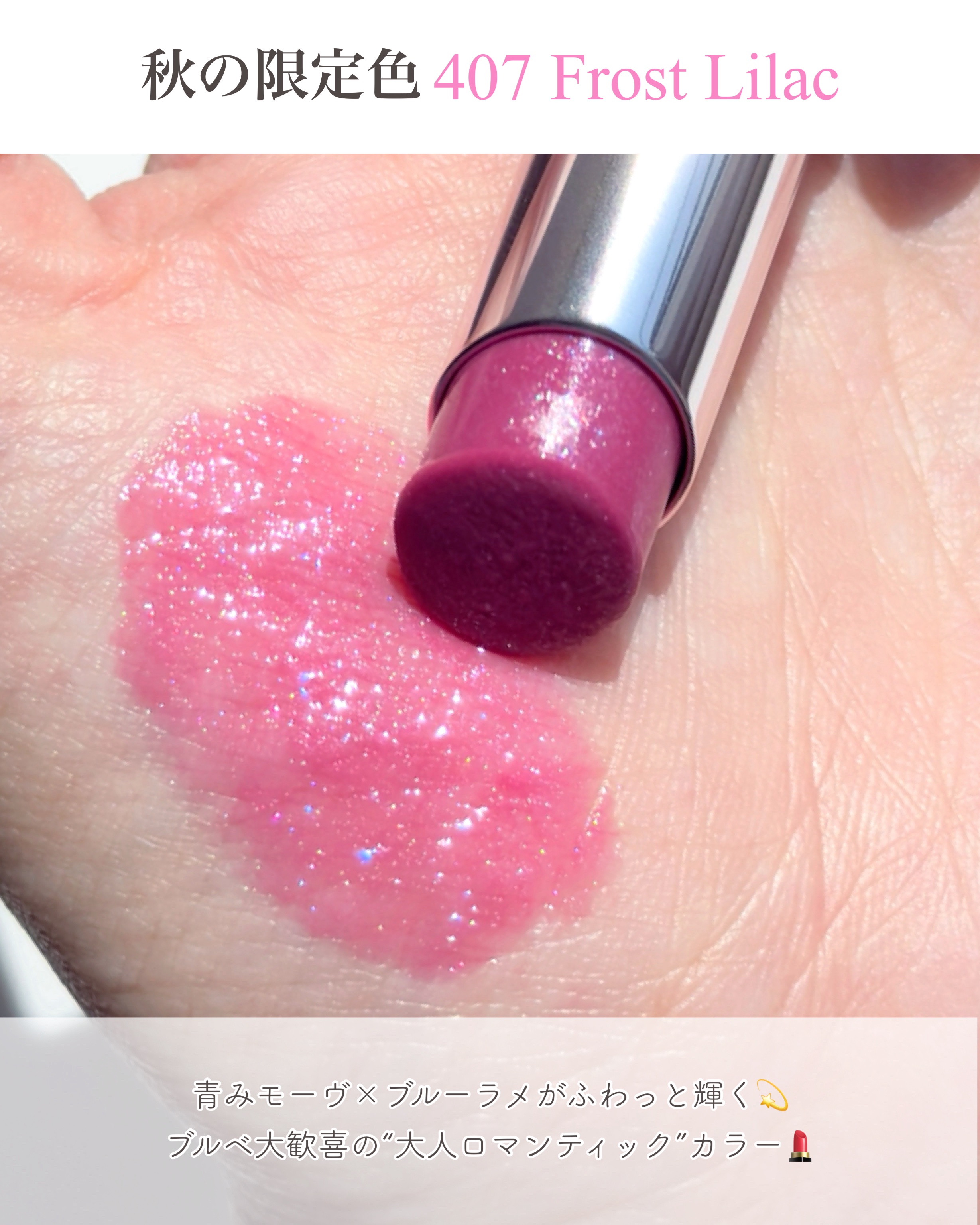 淡いけれど薄くはない、冬のキュートピンクリップという印象です。フロストライラックでほんのり白みとパープル感のあるピンクティント。発色が良くすごく可愛い色ですが大人っぽく甘さは控えめ。絶妙なカラーでこだわって調色してある感じがします。テクスチャ...