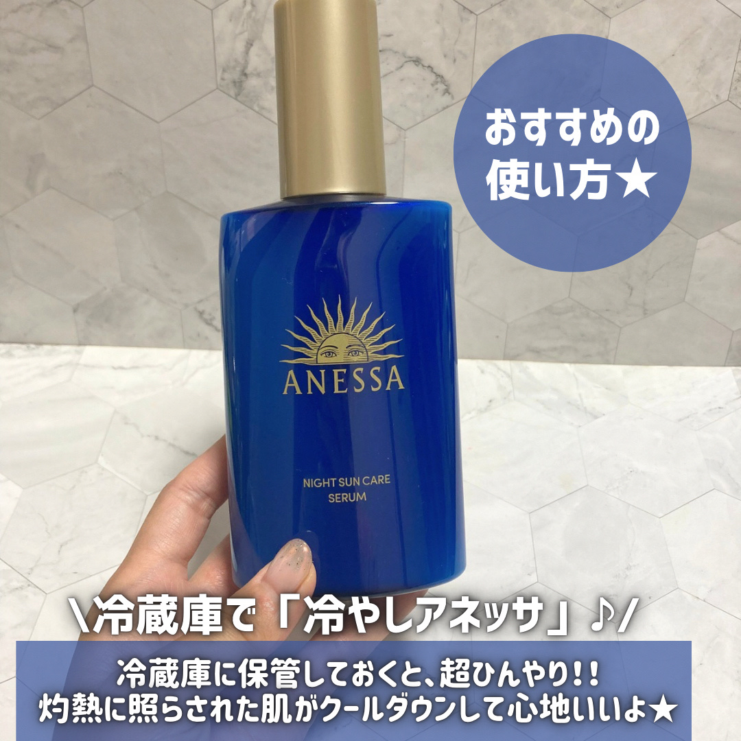 - 【医薬部外品】紫外線ダメージが気になる日の夜に、これ1本でうるおいながら全身の美白※1ケア&シワ改善薬用 ナイトサンケア美容液 ※1 美白とは、メラニンの生成を抑えシミ・そばかすを防ぐこと 紫外線ダメージが気になる肌に就寝中のうるおいケア。美白ケア※1&シワ改善まで。 たっぷりのうるおいで肌の天然バリア膜(角層)を整え、明るく透明感のある肌に導く。 1本で顔・首・腕など全身に使える薬用オールインワン美容液。 ○美白※1&シワ改善有効成分-ナイアシンアミド ○肌あれ防止有効成分-グリチルリチン酸塩 ○うるおいバリア成分-D-グルタミン酸 ○保湿成分:アロエベラエキス、明日葉エキス、緑茶エキス、トルメンチラエキス、グリセリン ○長時間保湿持続効果 ○さらっとした使用感でべたつかない ○すっとなじむ美容液 ○清々しいハーバルグリーン&ラベンダーの心地よい香り ○つめかえ可能なレフィル仕様 ○責任ある木質資源を使用したFSC®認証紙パッケージ ■使用法 ◆洗顔後やお風呂上がりに、お使いください。 ◆顔・首・腕など紫外線の浴びやすい部分を中心に適量を塗り広げてください。 ◆化粧水・乳液・美容液の機能を兼ね備えたオールインワン美容液であるため、これ1本でスキンケアを完了させることができます。お手持ちのスキンケアと合わせてお使いになる場合は、化粧水の後の使用をおすすめします。 ◆「冷やしアネッサ」:冷蔵庫で冷やしてお使いいただくことで清涼感もアップし清々しい使い心地を楽しんでいただくことができます。