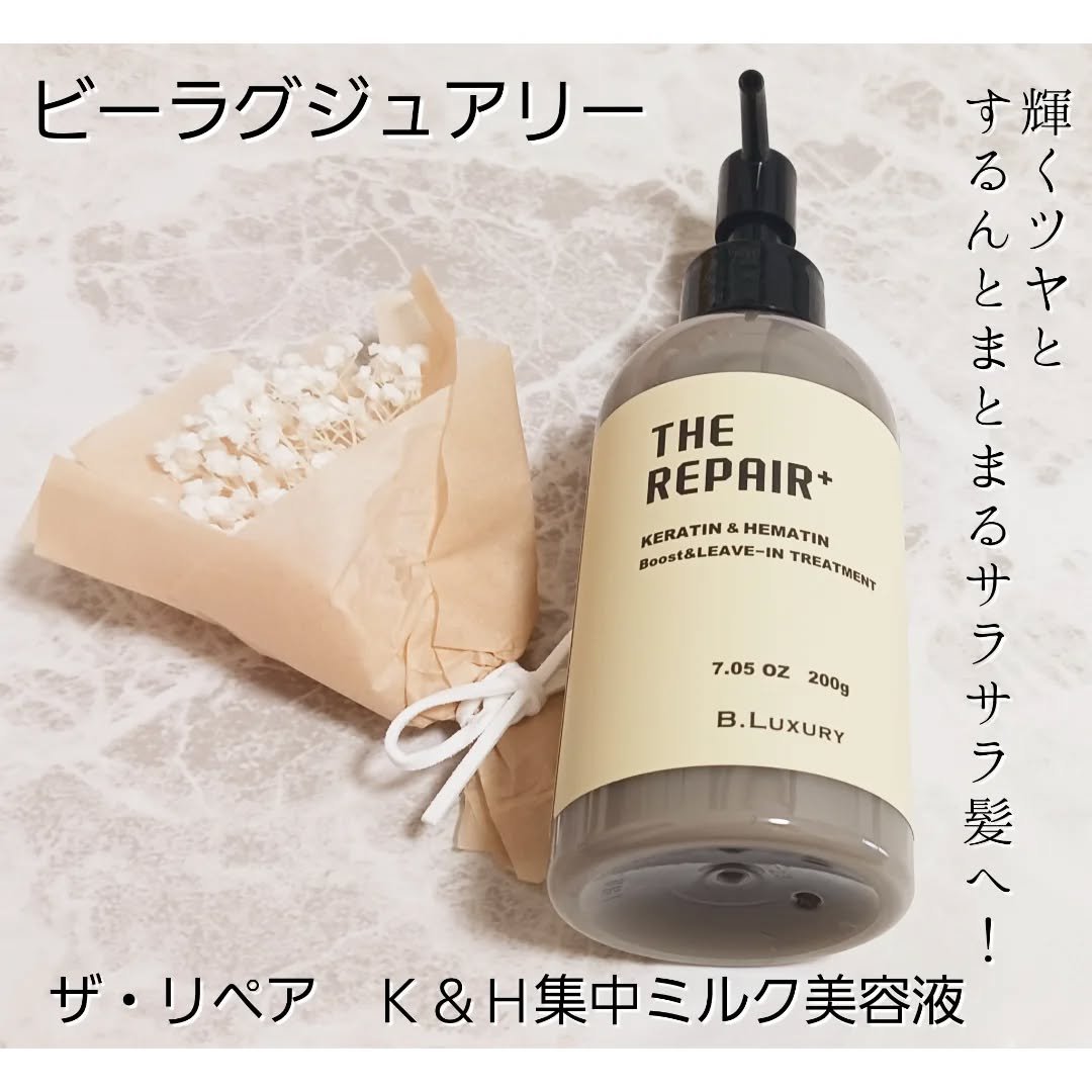 \髪にも美容液/ビーラグジュアリー ザ・リペア K&H集中ミルク美容液を使用しました🙆💛グレーのとろっとしたテクスチャーです✨たっぷり髪につけると、しっとりとした使用感でした☺️ポンプ式で手軽に使えるのも嬉しいです💕●質感アップサポート成分「...