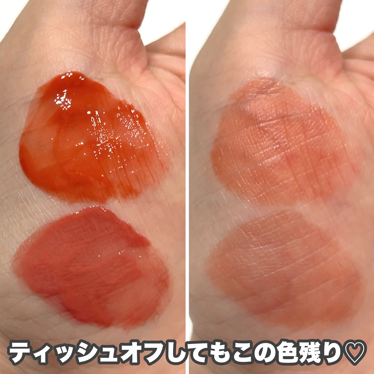 まずパケがめちゃくちゃ可愛くないですか?! 塗り心地はすっごいみずみずしい😳✨ 色味も変に浮いたりせずよかったしティッシュオフしてもこの色残り…!さすが🙌❤️ 今回のティントは、既存のティントより透明感が高く透け感のある塗り心地が特徴的で香りも強くないので韓国コスメが苦手な方でも大丈夫だと思います👯♀️✨ 本当にナチュラルにツヤっとするので一番使いやすいい質感のティントだと思いました🙌✨