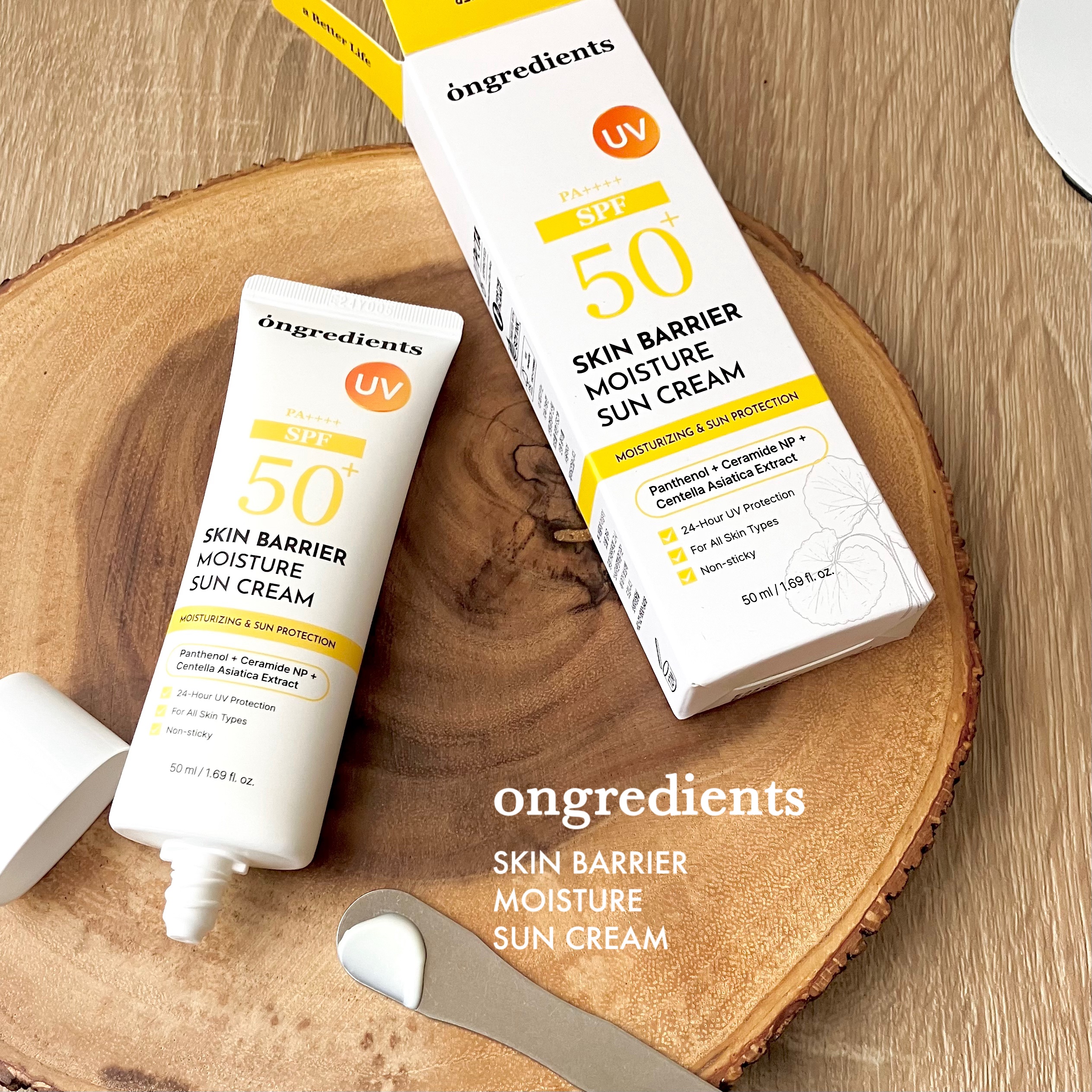 ongredientsスキンバリアモイスチャーサンクリーム50mlSPF50+/PA++++2000円(税込)※現Qoo10価格\敏感肌にも使える/塗った瞬間、まるで素肌⭐︎軽やかすぎるUVケアでうるさら感♡10,000ppmのパンテノール...