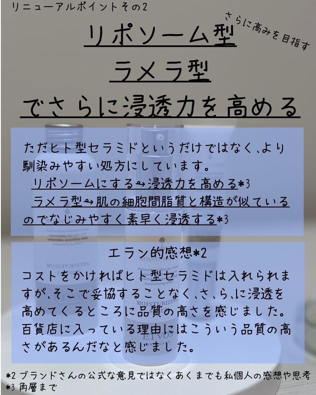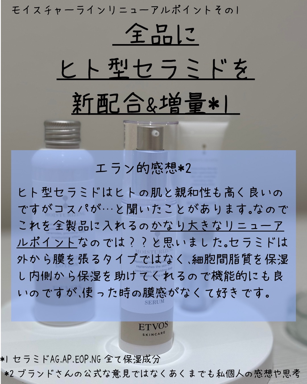 #PR#提供品#ETVOS#エトヴォス#敏感肌エトヴォスさまからいただきました。モイスチャーラインがパワーアップして登場してるよ🥳《リニューアルポイント》全品「ヒト型セラミド※1」配合&増量※2季節の変わり目や乾燥でお肌が敏感になってる時は特...