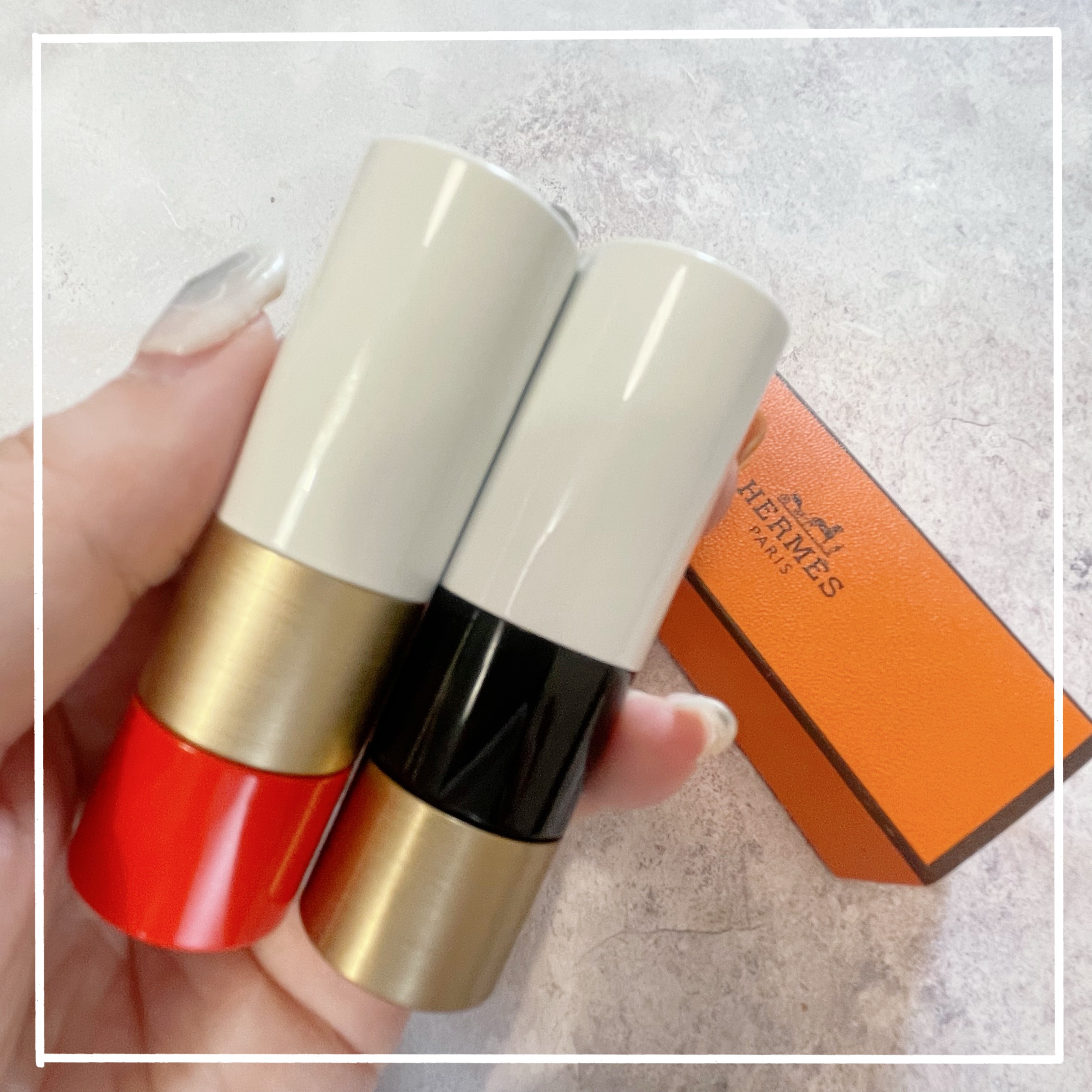 HERMESカラーのオレンジの箱と紙袋に梱包してもらえて最強に幸福になれる🥺💕 04番は朱色よりのピンク。とっても元気になる色で表情が明るく見えるのもポイントです🥰🥰 27番はすごくソフトなピンクでティントしてくれるから清楚系なお顔になれるのが最高にいい☺️💕