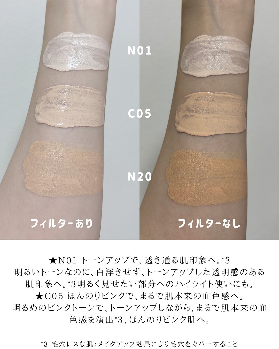 - 超うす膜なのに、崩れにくい。 全瞬間ビジュがいい。 1. 超うす膜が、ぴたっと密着 軽い微粒子が薄膜を作り、スーッと伸びて肌と一体化するように密着する、 「リアルスキンフィルム処方」を採用。 だから、時間がたっても、崩れにくい。 なのに、心地よさつづく。 2.毛穴レス*1で、透明感のある肌*2 薄膜なのに毛穴・くすみはぼかし、きめ細かく透けるような肌*1へ。 「ナイアシンアミド配合」*3 全6色展開 *1メイクアップ効果により毛穴をカバーすること *2メイクアップ効果による *3保湿効果 ※2026年2月10日〜パッケージリニューアル