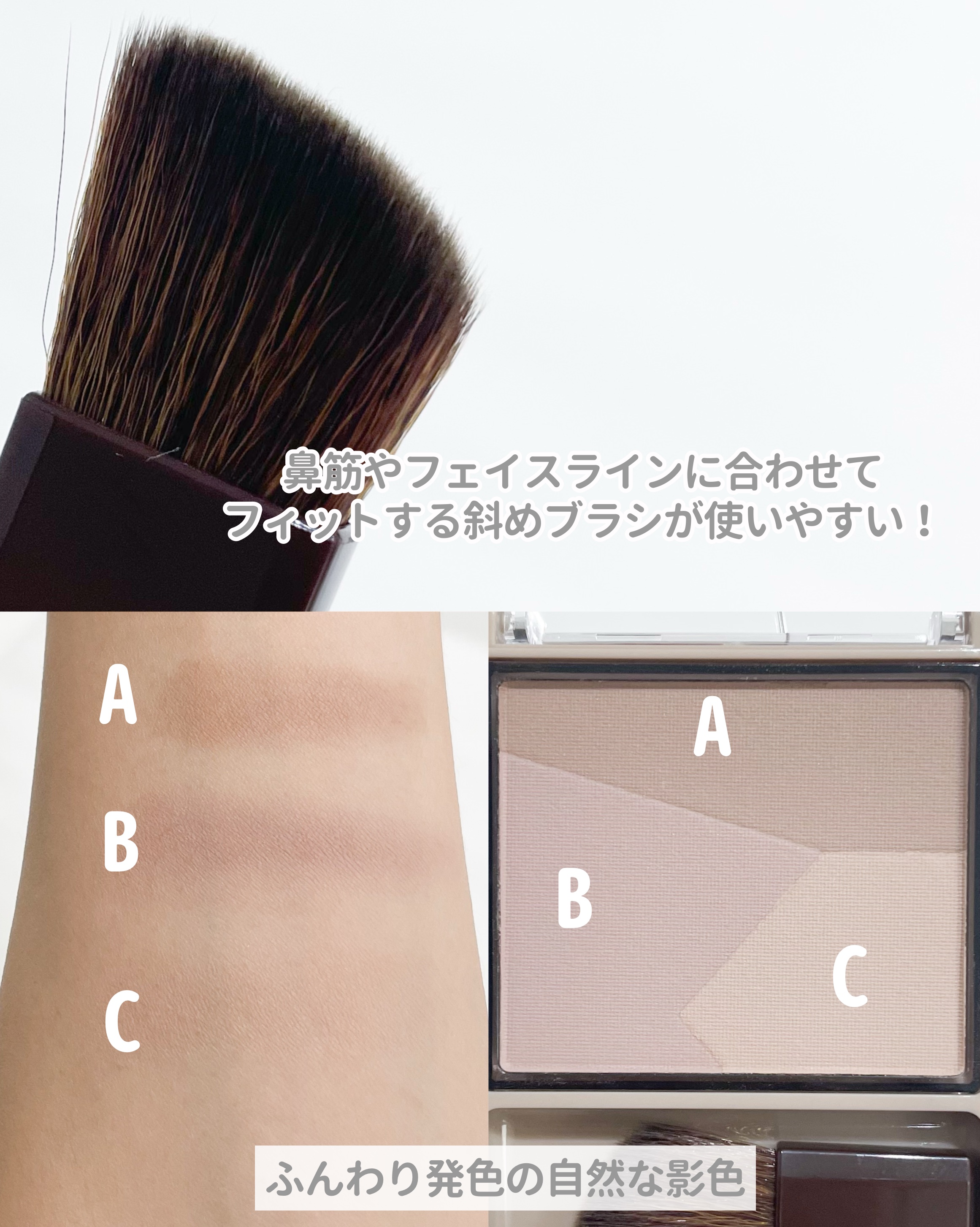 - 自然な陰影をプラスする3色グラデーションシェーディング。入れたい部分に合わせて濃淡・色味をぴったり調節できます。混ぜても一色ずつでも、使い方自由自在。 美容保湿成分(オリーブ果実油、バオバブ種子油、ヒアルロン酸Na)配合。 鼻筋にフィットする斜めカットブラシ付。 01 ウォームトーン:グレーが混ざったベージュ~ブラウンパレット。イエローベースの方、自然な陰影感が欲しい方に。肌色問わず使いやすい。迷ったらこれ。 02 クールトーン:グレーが混ざったベージュ~モーヴブラウンパレット。ブルーベースの方、より陰影感が欲しい方におすすめ。 03 メリハリトーン:マットなホワイトとグレーブラウンの組み合わせでメリハリ立体感を演出。肌色問わず使いやすい。 (ご使用方法) ブラシに適量を取り、輪郭や鼻筋の横など影を入れたい部分に塗布してください。単色はもちろん、お好きな色を混ぜてもお使いいただけます。 (使用上の注意) お肌に異常が生じていないかよく注意して使用してください。お肌に合わない時は、ご使用をおやめください。