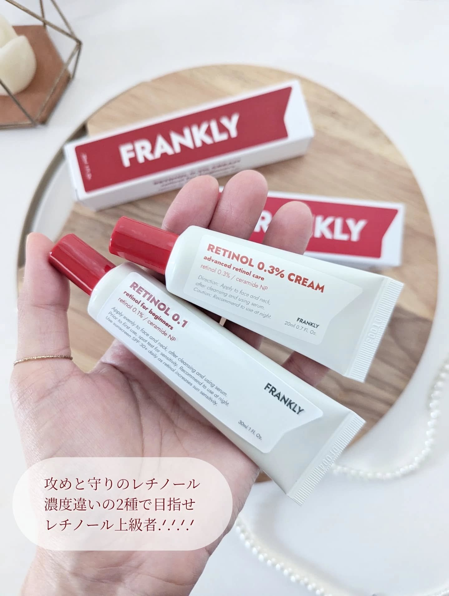 FRANKLY(フランクリー)の「レチノール0.3%クリーム」。レチノール(整肌成分)とナイアシンアミド(整肌成分)が配合されているクリームで、「攻め」と「守り」のケアを1本で!というのもの。濃度の違う2タイプがあって、レチノール0.3クリー...