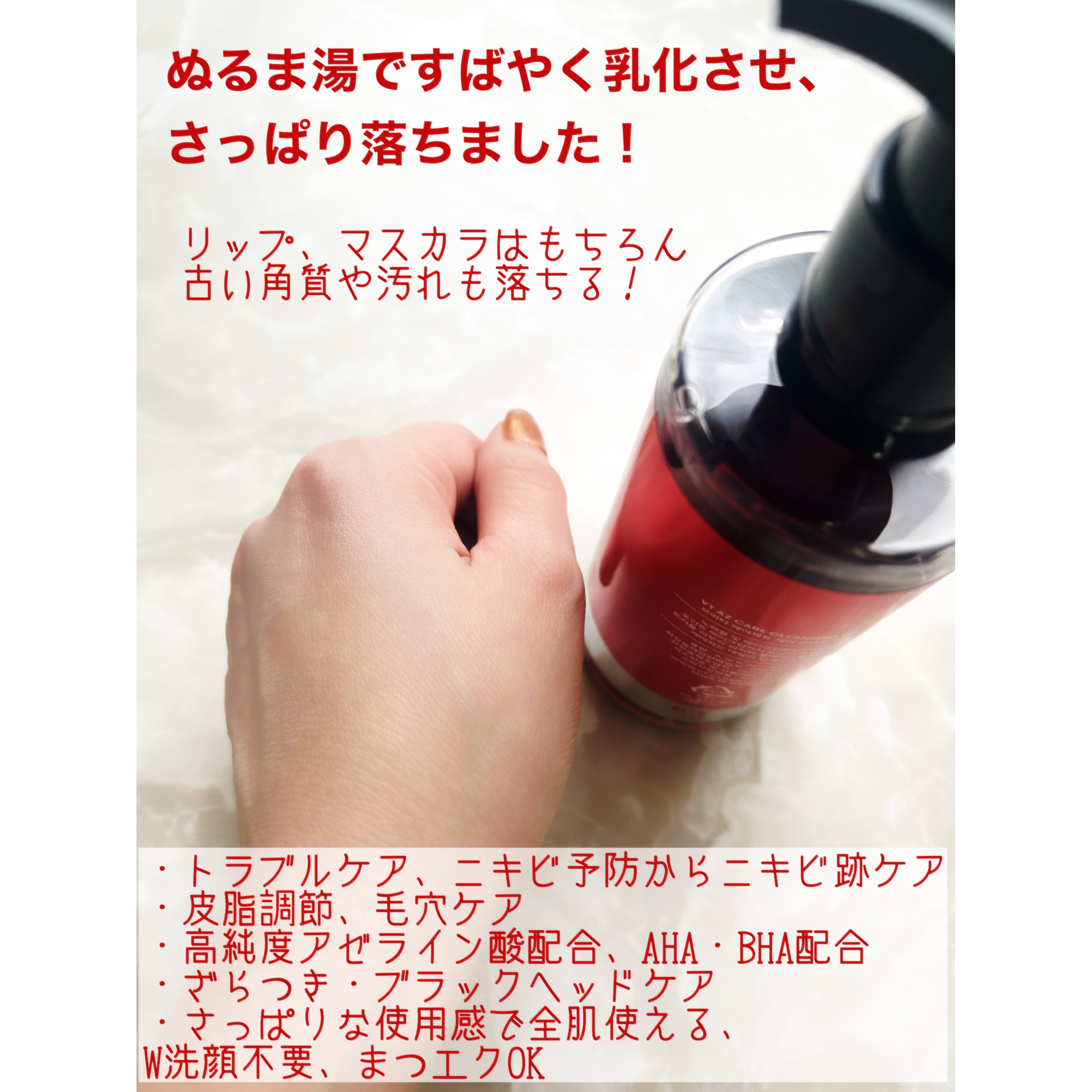 - 最近話題の毛穴ケア・整肌成分アゼライン酸!VTからはクレンジングオイルが登場! ポイントメイクまで落とすしっかりした洗浄力で、毛穴・皮脂までケアし保湿まで叶える一石三鳥アゼライン酸クレンジングオイル。 19種の植物性オイル*1も配合で、目に見えるブラッドヘッド*2から、隠れているホワイトヘッド*2、皮脂まですっきりケアします! ダブル洗顔不要! ※パッケージリニューアル ■このような方へおすすめ メイク・毛穴までディープクレンジング求める方 クレンジングでスキンケアまで行いたい方 ツッパリ感の少ないクレンジングを探していた方 ブラックヘッド*ケアも行いたい方 *1ダイズ油、アルガニアスピノサ核油、ユズ果実油、コメヌカ油、オタネニンジン種子油、アーモンド油、ザクロ種子油、リンゴ種子油、ホホバ種子油、ツバキ種子油、、バオバブ種子油、ユチャ種子油、ベニバナ種子油、ヒマワリ種子油、ヒポファエラムノイデス油、オリーブ果実油、アボカド油、アンズ核油、クロフサスグリ種子油(いずれも保湿) *2古い角質による