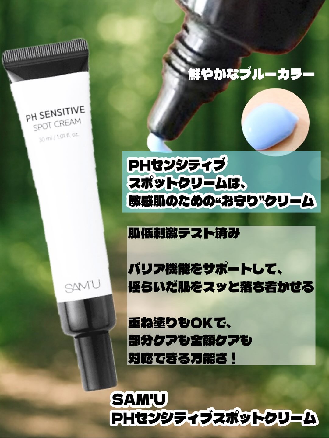 SAM'Uアンバサダーとしての投稿です#PR #商品提供PHSENSITIVESPOTCREAM水色の綺麗なクリーム。赤みが気になる部分に使えるクリームで顔全体的にも、部分的にも使えます。馴染ませると透明になり翌朝には赤みが引いていました。傷...