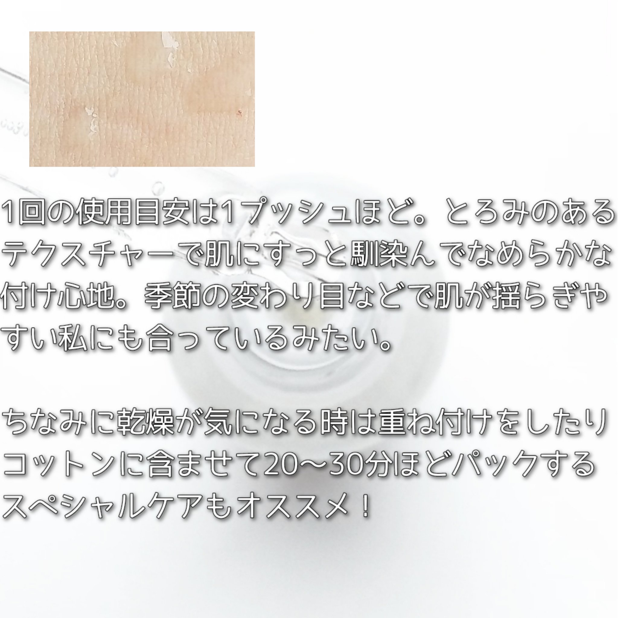 | とろみのあるテクスチャーだけど、肌にのばすとさらっとしていてみずみずしい使用感だよ☺️ | 詳細を見る | ||