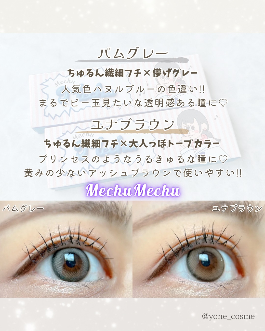 MechuMechu-ミチュミチュ-•ユナブラウン•パムグレー1dayコンタクトBC:8.7mmDIA:14.5mm着色直径13.8mm含水率:38.0%人気TikTokerのMizukiさんプロデュースのカラコン💗2025.4/25に発売さ...