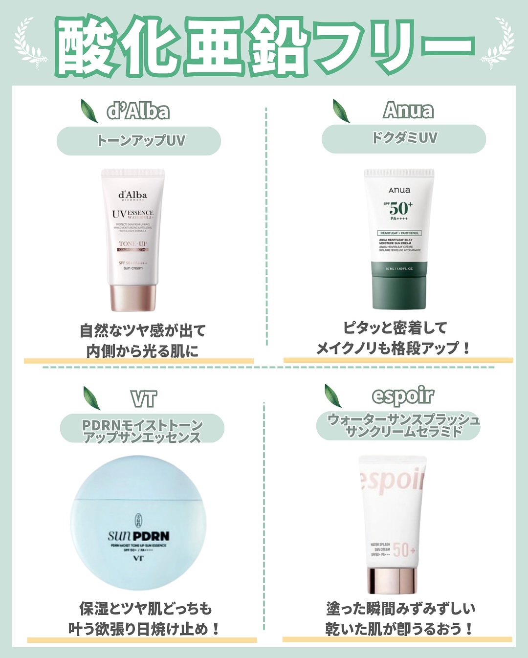 肌荒れの原因はそこかも🥲 日焼け止め、下地に酸化亜鉛が含まれているものがあります。あなたの肌荒れは酸化亜鉛が原因かも💧 そこで「酸化亜鉛フリー」の下地がおすすめなのです!どの下地が酸化亜鉛フリーのものなのかなかなか分かりにくいと思うので、 ぜひコメントやDMで教えてください😌