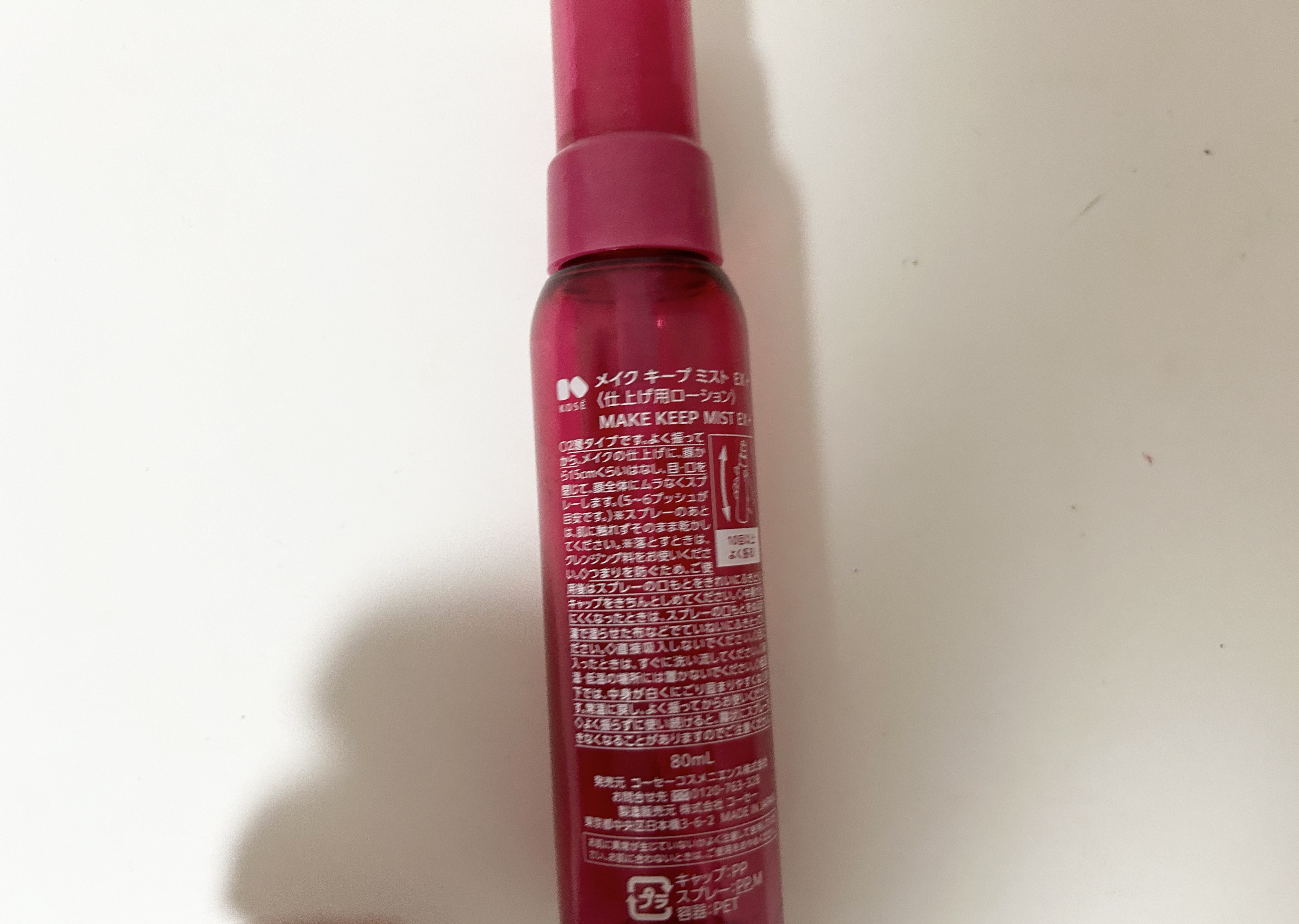 - メイク キープ ミスト EX + 長時間、化粧持ちデータ取得済み! ※当社調べ。個人差があります。 ●メイクの仕上げにシュッと吹きかけるだけで、蒸し暑い環境でも化粧くずれしにくくなるメイクキープミストです。 ●メイクよれ防止効果がプラスとなり、メイクキープ効果が衝撃パワーアップ! コーセーオリジナルの「スーパーメイクコート成分」を新配合。 表情の動きにもよれにくく高い柔軟性をもつため、 表情の変化によるメイクよれを防止。 美しい仕上がりをキープします。 ●スーパーウォータープルーフヘパワーアップ! 汗・水・涙にも強く、撥水効果を発揮します。 撥水性の高い膜が、 隙間なく均一に肌へ密着。 汗・ 水 ・ 涙をしっかりはじき、メイクくずれを防ぎます。 ●高い皮脂プルーフ効果で、 テカリ&毛穴落ち防止効果がパワーアップ! 皮脂テカリ・くずれ防止成分が皮脂をはじくと同時にテカリを防止。 テカリだけでなく、 メイクの毛穴落ちまで防ぎます。 ●高温多湿試験済み※! 蒸し暑い環境でもテカリやベタつきを防ぎ、 美しい仕上がりをキープします。 ※化粧もちに関して (コーセー調べ。 効果には個人差があります。) ●ふんわり細やかなミストが均一な1枚の膜を形成! つけたての美しいメイクを長時間キープ。 メイクをしっかり固定しながら、顔の動きに合わせて伸縮する膜を肌表面に形成。 時間が経ってもメイクがよれにくく、 美しい仕上がりが長時間持続します。 ●新配合のシカ成分をはじめとする数種の保湿成分を贅沢に配合! 肌にうるおいをあたえ、 乾燥を防ぎます。 マスク着用によるメイクのよれや、マスクへのメイク移りを防ぎます。 大気中の微粒子(ちり・ほこり・PM2.5など) からお肌をまもります。 ●アレルギーテスト済み ●ノンコメドジェニックテスト済み ※すべてのかたにアレルギーが起きない、コメド (ニキビのもと)ができないというわけではありません。 ジューシーフローラルの香り 無着色 ※スーパーメイクコート成分は(ジメチコン/ビニルトリメチルシロキシケイ酸)クロスポリマー、汗・皮脂プルーフ成分はトリメチルシロキシケイ酸、皮脂テカリ・くずれ防止成分は(ジメチコン/ビニルジメチコン)クロスポリマー、シカ成分はツボクサ葉エキス、ヒアルロン酸は加水分解ヒアルロン酸、コラーゲンは加水分解コラーゲンです。 <ご注意> 低温下では中身が白く固まりやすくなりますが、 常温に戻すために湯せんや電子レンジなどを使って高い温度で温めると品質が変化してしまいます。 さらには容器が変形・破損することで、やけどや怪我の恐れがあります。 大変危険ですので、湯せんや電子レンジなどを使って加熱することは絶対にお避けください。