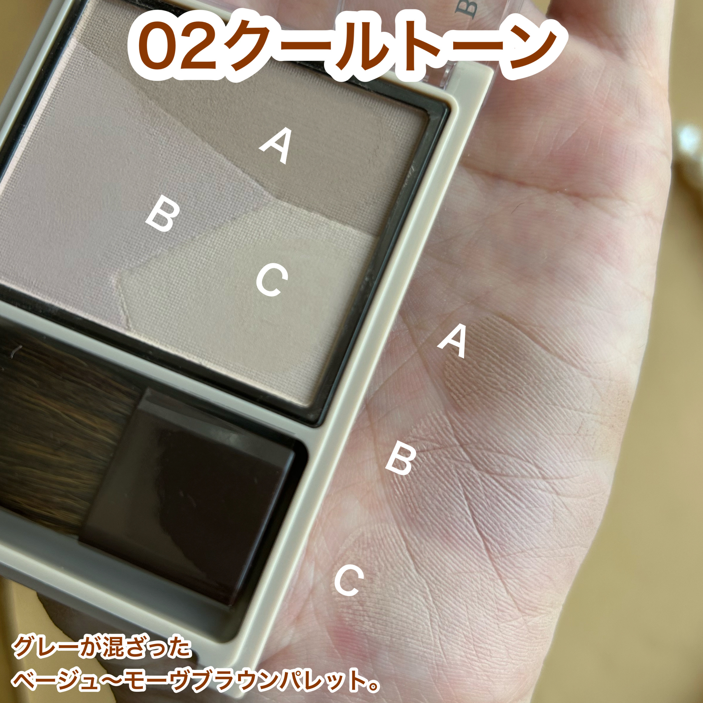 - 自然な陰影をプラスする3色グラデーションシェーディング。入れたい部分に合わせて濃淡・色味をぴったり調節できます。混ぜても一色ずつでも、使い方自由自在。 美容保湿成分(オリーブ果実油、バオバブ種子油、ヒアルロン酸Na)配合。 鼻筋にフィットする斜めカットブラシ付。 01 ウォームトーン:グレーが混ざったベージュ~ブラウンパレット。イエローベースの方、自然な陰影感が欲しい方に。肌色問わず使いやすい。迷ったらこれ。 02 クールトーン:グレーが混ざったベージュ~モーヴブラウンパレット。ブルーベースの方、より陰影感が欲しい方におすすめ。 03 メリハリトーン:マットなホワイトとグレーブラウンの組み合わせでメリハリ立体感を演出。肌色問わず使いやすい。 (ご使用方法) ブラシに適量を取り、輪郭や鼻筋の横など影を入れたい部分に塗布してください。単色はもちろん、お好きな色を混ぜてもお使いいただけます。 (使用上の注意) お肌に異常が生じていないかよく注意して使用してください。お肌に合わない時は、ご使用をおやめください。