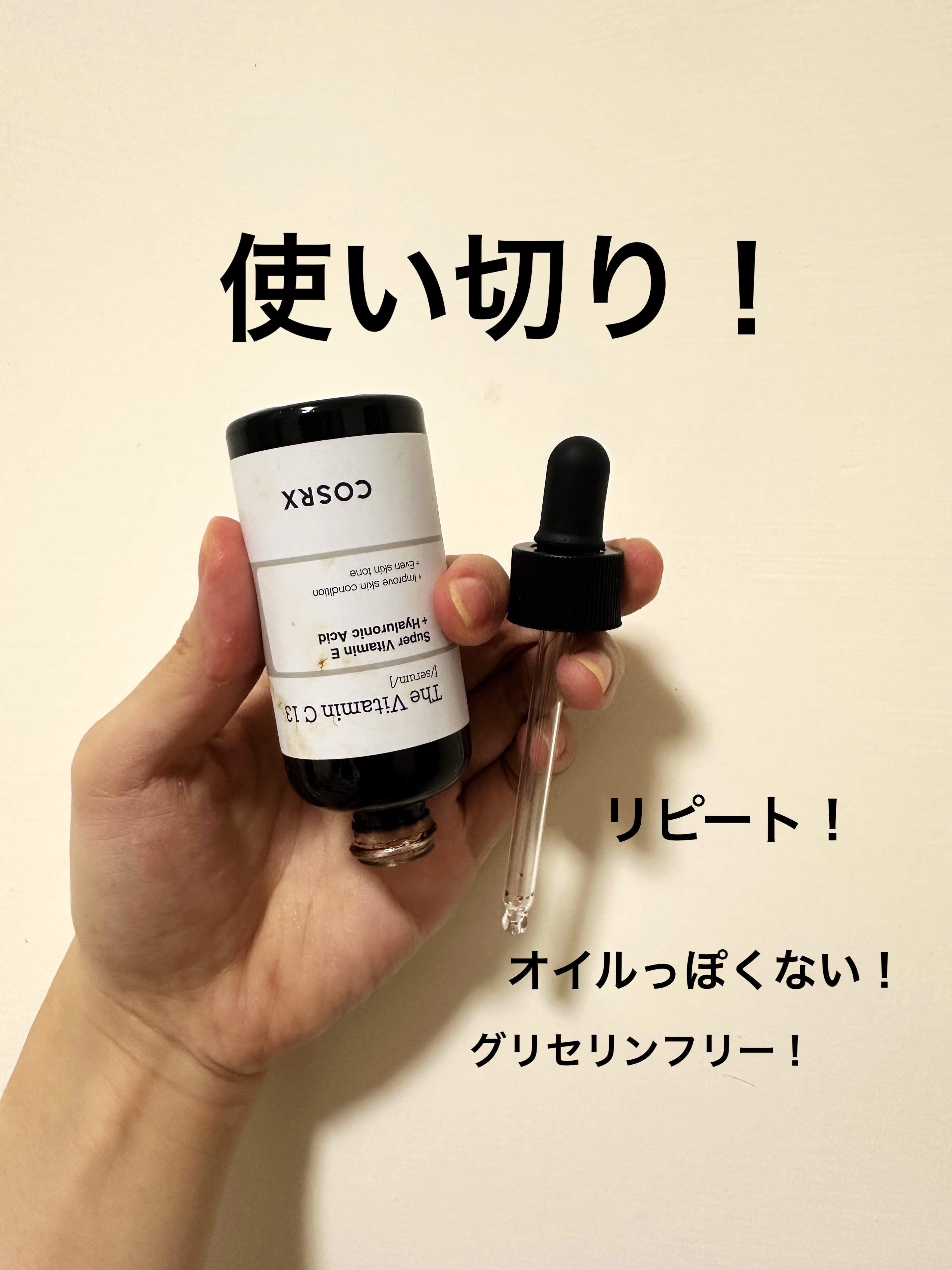 CosRXはプチプラな上、本当に肌に有効だと臨床試験で証明された成分だけにこだわっているブランドで、デザインもコンセプトも私はとても好き。 攻めの成分: アンチエイジングへの有効性が最も広く認められている成分、ビタミンc、レチノール、ナイアシンアミド、ペプチドの4種がそれぞれ高濃度配合。 とにかくコスパがいい!日本製のもので、同じクオリティーとバラエティーでここまで低価格なものはほぼ存在しないと思う。