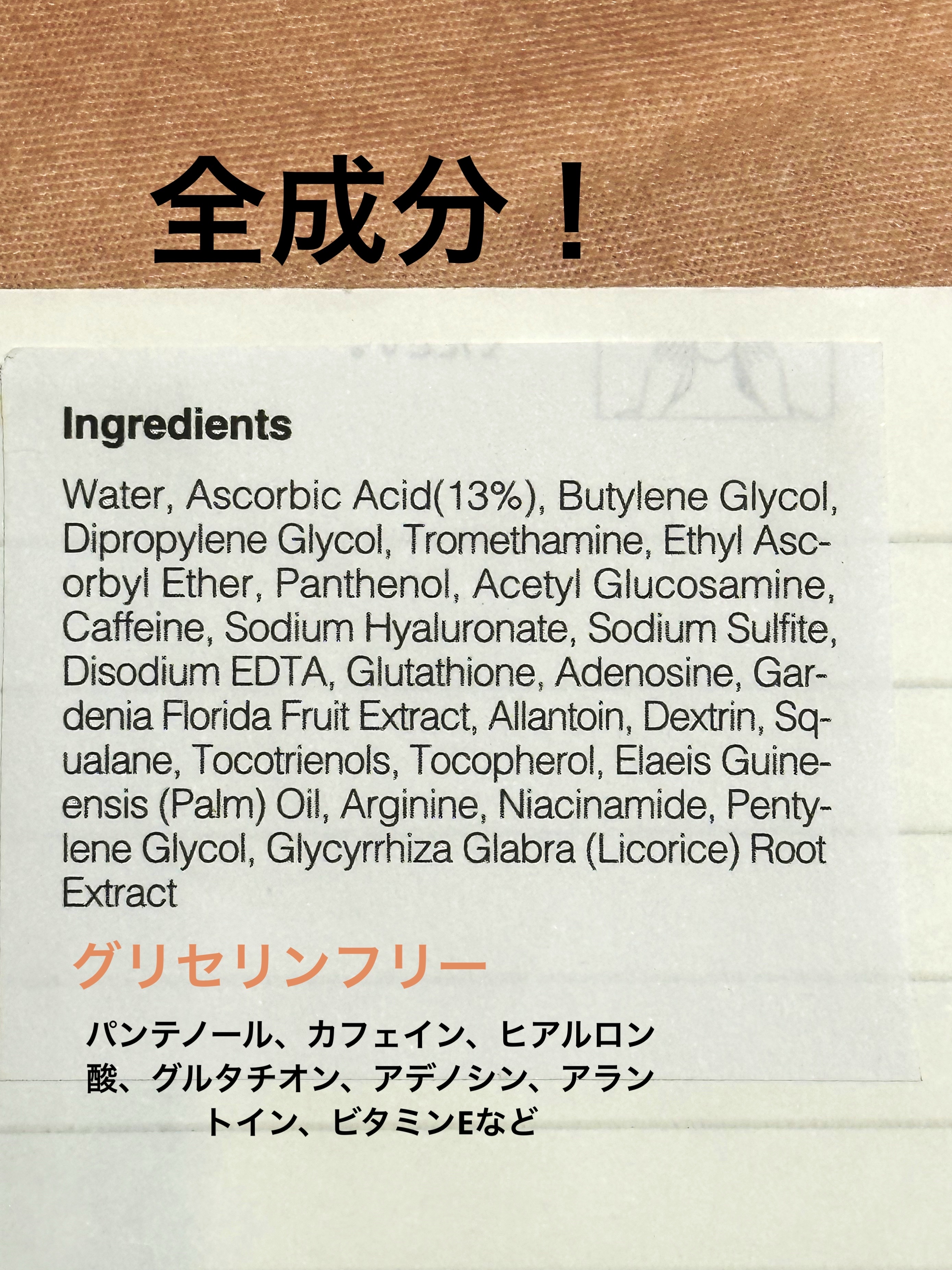 - <20ml> 精製水、アスコルビン酸 (13%)、BG、ジプロピレングリコール、トロメタミン、アスコルビルエチル、パンテノール、アセチルグルコサミン、カフェイン、ヒアルロン酸ナトリウム、亜硫酸ナトリウム、EDTA-2Na、グルタチオン、アデノシン、クチナシ果実エキス、アラントイン、デキストリン、スクワラン、トコトリエノール、トコフェロール、パーム油、アルギニン、ナイアシンアミド、ペンチレングリコール、カンゾウ根エキス