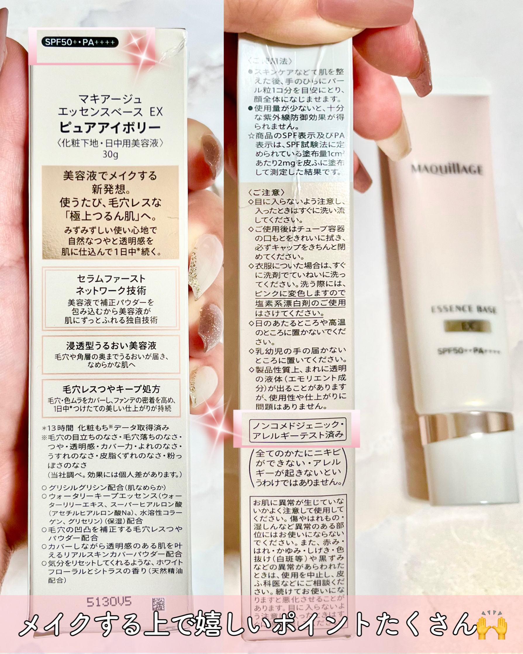 - 美容液で、下地もできる。どんどんきれいになる*。 下地に美容液を配合するのではなく、たっぷりの美容液で補正パウダーなどの下地成分を包む独自の「セラムファーストネットワーク技術」を搭載。つけている間、美容液が肌にふれつづけます。 Point1 10種*¹の美容液成分配合 グリシルグリシン(肌なめらか)をはじめとする10種*¹の美容液成分を配合。 うるおいにあふれた、なめらかな肌に導きます。 Point2 毛穴レスつやキープ処方 美容液のようなみずみずしい使い心地で、隠ぺい感なく、 毛穴・色ムラをカバーしながら、自然なつやと透明感を叶えます。 1日中*²つけたての美しい仕上がりが持続。 〇気分をリセットしてくれるような、ホワイトフローラルとシトラスの香り(天然精油配合) 〇ノンコメドジェニック・アレルギーテスト済み ※全てのかたにニキビができない・アレルギーが起きないというわけではありません。 *メイク効果による *¹ グリシルグリシン(肌なめらか)、ウォータリーキープエッセンス(ウォーターリリーエキス、スーパーヒアルロン酸(アセチルヒアルロン酸Na)水溶性コラーゲン、グリセリン)(保湿)トレハロース(うるおい保持)、 メチルポリシロキサン(エモリエント)、トリ脂肪酸(C10-18)グリセリル(エモリエント)、うるおい成分(サクシノグリカン、1,3ブチリングリコール)(保湿) *² 13時間化粧もち(毛穴の目立ちのなさ・毛穴落ちのなさ・つや・透明感・カバー力・よれのなさ・うすれのなさ・皮脂くずれのなさ・粉っぽさのなさ)データ取得済み(当社調べ。効果には個人差があります。)