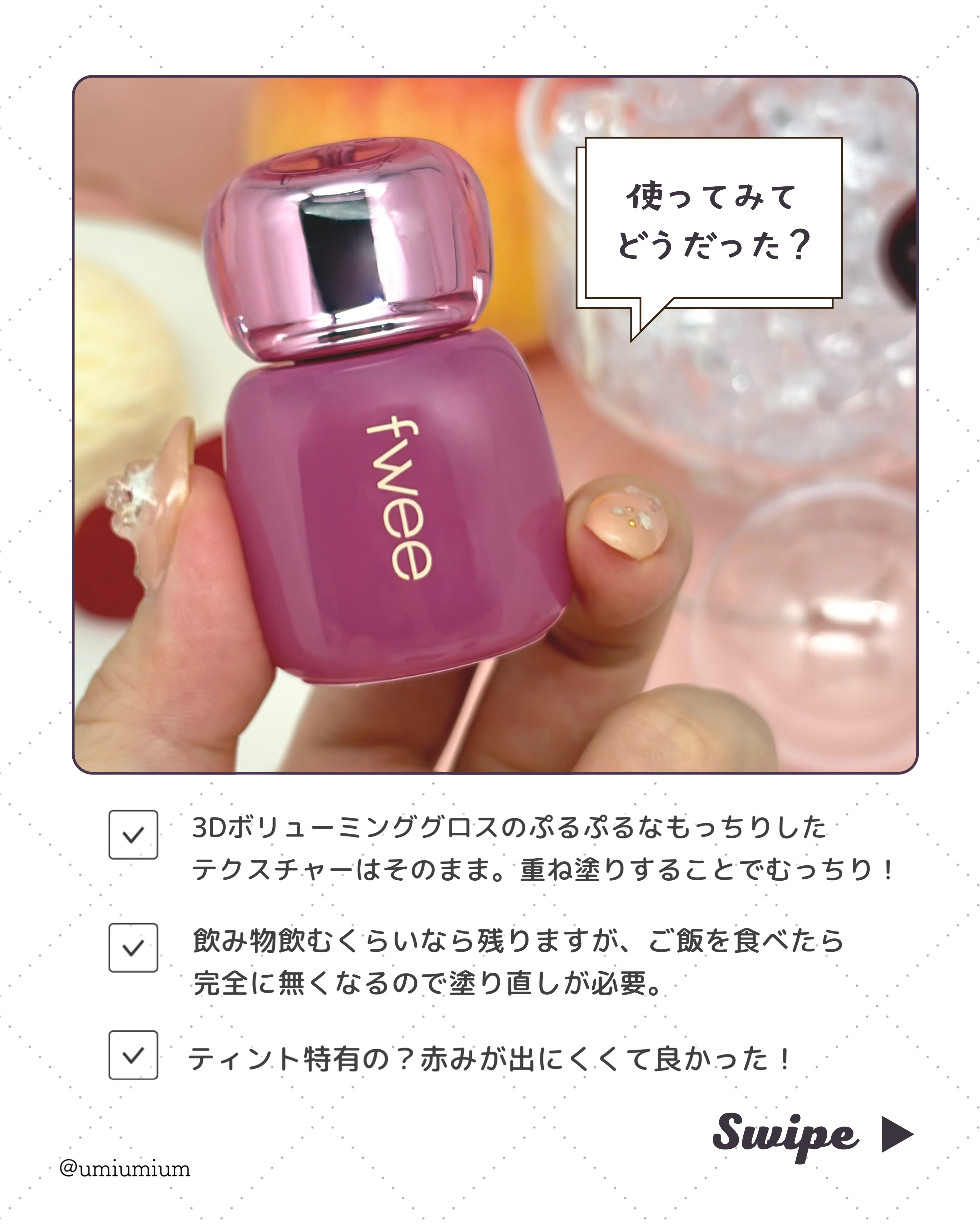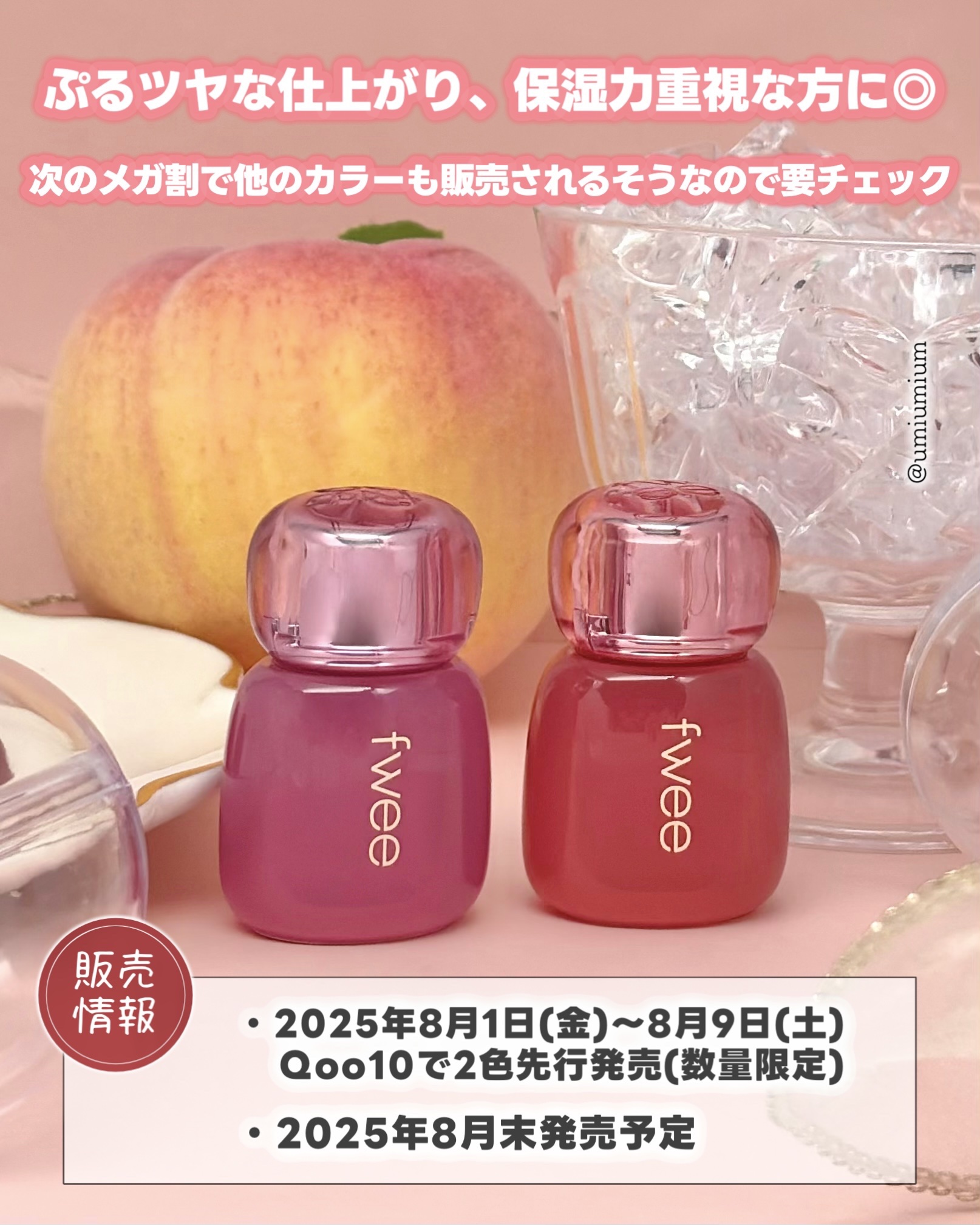 .\無事にゲットだせ!/Qoo10メガポで先行発売しているfweeの新作リップかわいすぎた🥰これから出てくる他のカラーも楽しみ!先行発売は一応8/923:59までで01は既に完売していたので気になる方はお早めに💦重ねてもちゅるんが増えてベタつ...