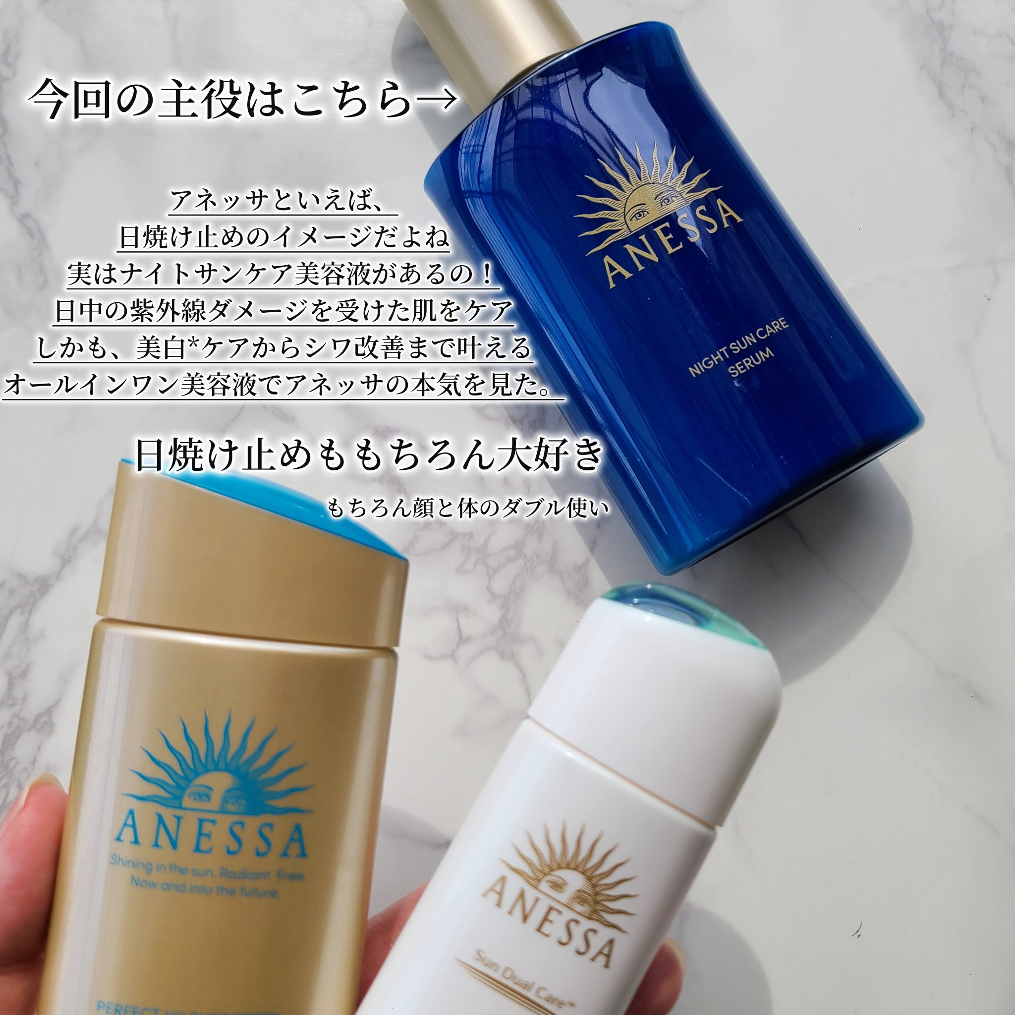 .アネッサさまから提供していただきました。アネッサスキンセラム〈医薬部外品〉薬用ナイトサンケア美容液\美白*1ケア&しわ改善✨/就寝中にこれ一本で紫外線ダメージをリセット!顔・首・腕など全身に使えます。オールインワンタイプなので楽チン😉肌荒れ...