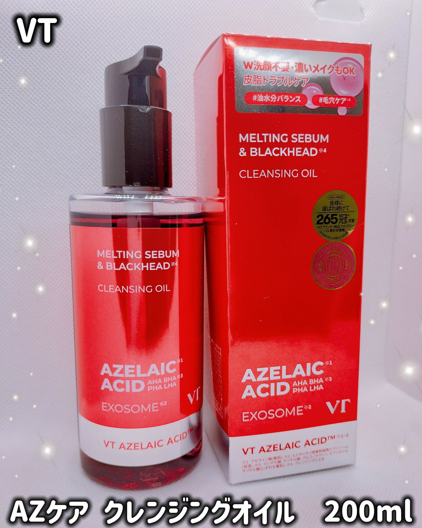 - 最近話題の毛穴ケア・整肌成分アゼライン酸!VTからはクレンジングオイルが登場! ポイントメイクまで落とすしっかりした洗浄力で、毛穴・皮脂までケアし保湿まで叶える一石三鳥アゼライン酸クレンジングオイル。 19種の植物性オイル*1も配合で、目に見えるブラッドヘッド*2から、隠れているホワイトヘッド*2、皮脂まですっきりケアします! ダブル洗顔不要! ※パッケージリニューアル ■このような方へおすすめ メイク・毛穴までディープクレンジング求める方 クレンジングでスキンケアまで行いたい方 ツッパリ感の少ないクレンジングを探していた方 ブラックヘッド*ケアも行いたい方 *1ダイズ油、アルガニアスピノサ核油、ユズ果実油、コメヌカ油、オタネニンジン種子油、アーモンド油、ザクロ種子油、リンゴ種子油、ホホバ種子油、ツバキ種子油、、バオバブ種子油、ユチャ種子油、ベニバナ種子油、ヒマワリ種子油、ヒポファエラムノイデス油、オリーブ果実油、アボカド油、アンズ核油、クロフサスグリ種子油(いずれも保湿) *2古い角質による