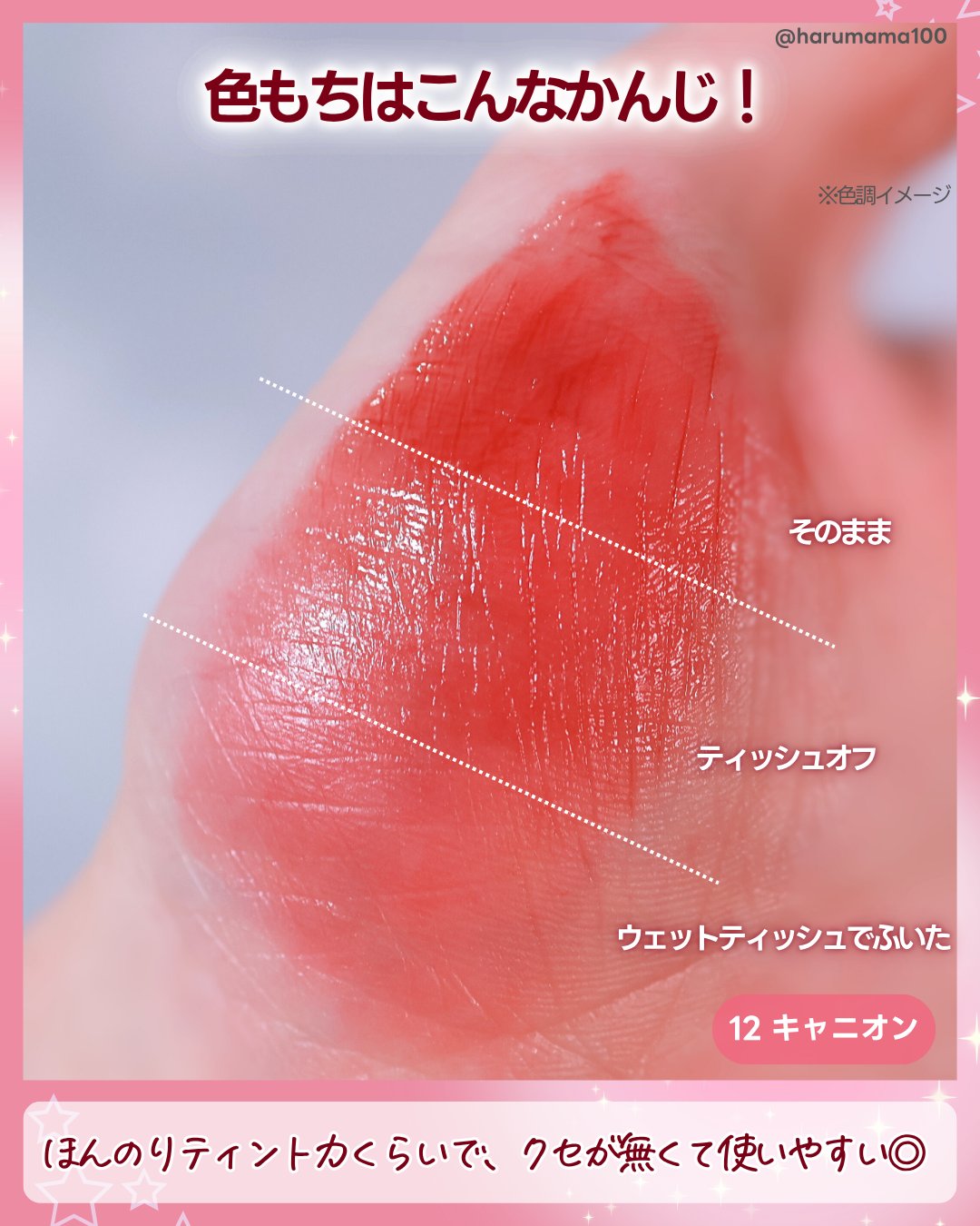 - <01 インコーラル> 水、ビスジグリセリルポリアシルアジペート-2、グリセリン、ジフェニルジメチコン、ジフェニルシロキシフェニルトリメチコン、ポリグリセリン-3、リンゴ酸ジイソステアリル、水添ポリイソブテン、ポリブテン、トリメチルシロキシフェニルジメチコン、変性アルコール、ポリソルベート60、イソノナン酸イソノニル、ペンチレングリコール、(アクリル酸ヒドロキシエチル/アクリロイルジメチルタウリンNa)コポ リマー、ラベンダーエキス、ハナハッカ花/葉/茎エキス、ローズマリーエキス、タイムエキス、ステアリン酸グリセリル、ステアリン酸PEG-100、スクワラン、ラウリルPEG-10トリス(トリメチルシロキシ)シリルエチルジメチコン、エチルヘキシルグリセリン、デキストリン、ステビオシド、イソステアリン酸ソルビタン、エチレンジアミンジコハク酸3Na、水酸化Al、ポリアクリル酸アンモニウム、BG、トコフェロール、フェノキシエタノール、香料、リモネン、酸化チタン、黄5、赤227、黄4、青1 <03 イフローズ> 水、ビスジグリセリルポリアシルアジペート-2、グリセリン、ジフェニルジメチコン、ジフェニルシロキシフェニルトリメチコン、ポリグリセリン-3、リンゴ酸ジイソステアリル、水添ポリイソブテン、ポリブテン、トリメチルシロキシフェニルジメチコン、変性アルコール、ポリソルベート60、イソノナン酸イソノニル、ペンチレングリコール、(アクリル酸ヒドロキシエチル/アクリロイルジメチルタウリンNa)コポリマー、ラベンダーエキス、ハナハッカ花/葉/茎エキス、ローズマリーエキス、タイムエキス、ステアリン酸グリセリル、ステアリン酸PEG-100、スクワラン、ラウリルPEG-10トリス(トリメチルシロキシ)シリルエチルジメチコン、エチルヘキシルグリセリン、デキストリン、ステビオシド、トリイソステアリン酸ポリグリセリル-2、イソステアリン酸ソルビタン、エチレンジアミンジコハク酸3Na、水酸化Al、ポリアクリル酸アンモニウム、BG、トコフェロール、フェノキシエタノール、香料、リモネン、酸化チタン、黄5、赤227、青1、黄4、赤218 <04 チリアップ> 水、ビスジグリセリルポリアシルアジペート-2、グリセリン、ジフェニルジメチコン、ジフェニルシロキシフェニルトリメチコン、ポリグリセリン-3、リンゴ酸ジイソステアリル、水添ポリイソブテン、ポリブテン、トリメチルシロキシフェニルジメチコン、変性アルコール、ポリソルベート60、イソノナン酸イソノニル、ペンチレングリコール、(アクリル酸ヒドロキシエチル/アクリロイルジメチルタウリンNa)コポ リマー、ラベンダーエキス、ハナハッカ花/葉/茎エキス、ローズマリーエキス、タイムエキス、ステアリン酸グリセリル、ステアリン酸PEG-100、スクワラン、ラウリルPEG-10トリス(トリメチルシロキシ)シリルエチルジメチコン、エチルヘキシルグリセリン、デキストリン、ステビオシド、イソステアリン酸ソルビタン、エチレンジアミンジコハク酸3Na、トコフェロール、BG、フェノキシエタノール、料、リモネン、黄5、赤227、黄4、青1 <06 チュリアン> 水、ビスジグリセリルポリアシルアジペート-2、グリセリン、ジフェニルジメチコン、ジフェニルシロキシフェニルトリメチコン、ポリグリセリン-3、リンゴ酸ジイソステアリル、水添ポリイソブテン、ポリブテン、トリメチルシロキシフェニルジメチコン、変性アルコール、ポリソルベート60、イソノナン酸イソノニル、ペンチレングリコール、(アクリル酸ヒドロキシエチル/アクリロイルジメチルタウリンNa)コポリマー、ラベンダーエキス、ハナハッカ花/葉/茎エキス、ローズマリーエキス、タイムエキス、ステアリン酸グリセリル、ステアリン酸PEG-100、スクワラン、ラウリルPEG-10トリス(トリメチルシロキシ)シリルエチルジメチコン、エチルヘキシルグリセリン、デキストリン、ステビオシド、イソステアリン酸ソルビタン、エチレンジアミンジコハク酸3Na、水酸化Al、ポリアクリル酸アンモニウム、BG、トコフェロール、フェノキシエタノール、香料、リモネン、酸化チタン、黄5、赤227、酸化鉄、黄4、赤218、青1 <08 ベリーディヴァイン> 水、ビスジグリセリルポリアシルアジペート-2、グリセリン、ジフェニルジメチコン、ジフェニルシロキシフェニルトリメチコン、ポリグリセリン-3、リンゴ酸ジイソステアリル、水添ポリイソブテン、ポリブテン、トリメチルシロキシフェニルジメチコン、変性アルコール、ポリソルベート60、イソノナン酸イソノニル、ペンチレングリコール、(アクリル酸ヒドロキシエチル/アクリロイルジメチルタウリンNa)コポリマー、ラベンダーエキス、ハナハッカ花/葉/茎エキス、ローズマリーエキス、タイムエキス、ステアリン酸グリセリル、ステアリン酸PEG-100、スクワラン、ラウリルPEG-10トリス(トリメチルシロキシ)シリルエチルジメチコン、エチルヘキシルグリセリン、イソステアリン酸ソルビタン、デキストリン、ステビオシド、エチレンジアミン