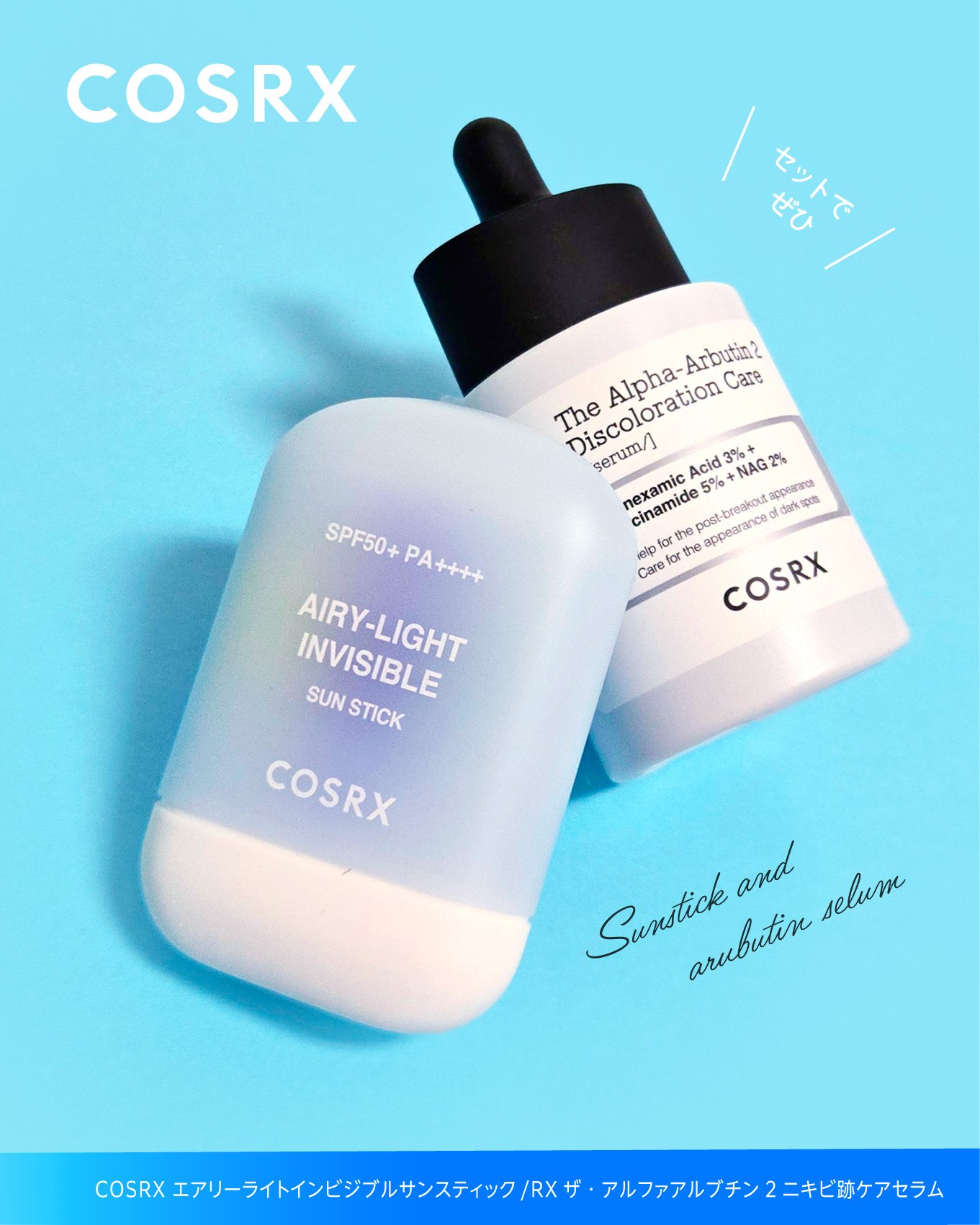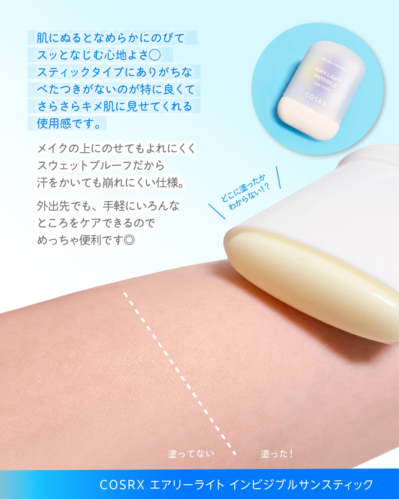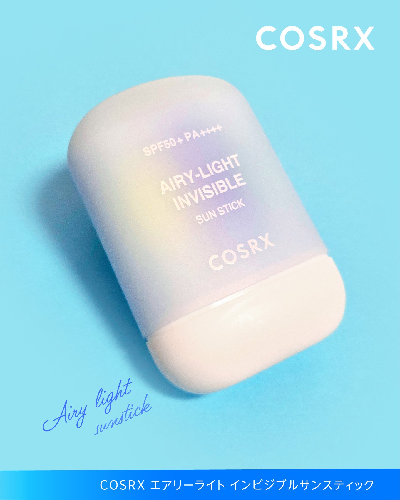 COSRXAIRY-LIGHTINVISIBLESUNSTICKエアリーライトインビジブルサンスティック19g2,530円(税込) まるで空気のような圧倒的軽さ✅油分を抑えるセバムコントロール機能で、余分な皮脂や汗によるベ...