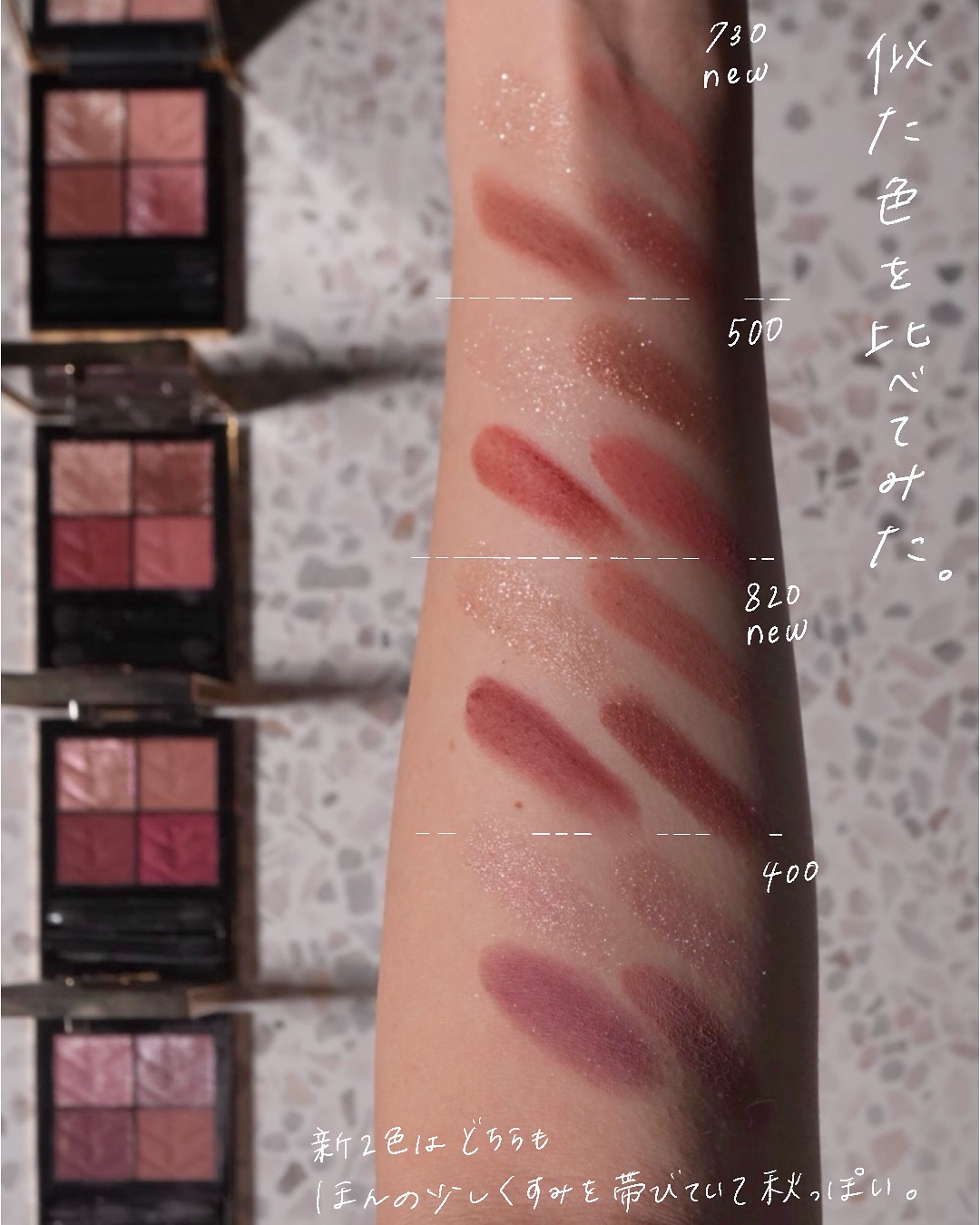 アンプリのベーシック系のカラーの中でもひときわニュートラルな、色味を削いだようなベージュブラウン。 こちらも少し前(7/30)にレビューしているのでそちらもご参考いただけたら🙇♀️ このパレットはベーシックでありながらトレンド感もあるところがお気に入りポイントでして、ちょっとセピアを帯びたようなくすみ感がなんとも言えずお洒落な雰囲気を醸し出してくれます。 というのは全体的に肌に馴染むようなヌーディカラーで構成されたすごくナチュラルなシェードなんだけど、シルバー系のパールが潜んでいたり、少しくすみ感があったりと、甘さを取り除いてクールな仕上がりになるところがめちゃくちゃかっこいいのよ。 ダイヤモンドを彷彿とさせるような大粒のラメの煌めきがたまらなく美しいアイカラーです。 このパレットの好きなところは、マットが主役なところ。絶妙にニュアンスの異なる3色のマットでグラデーションしやすいのがミソです。 パールカラーの入れ方次第で表情が変わるパレットだと思う。