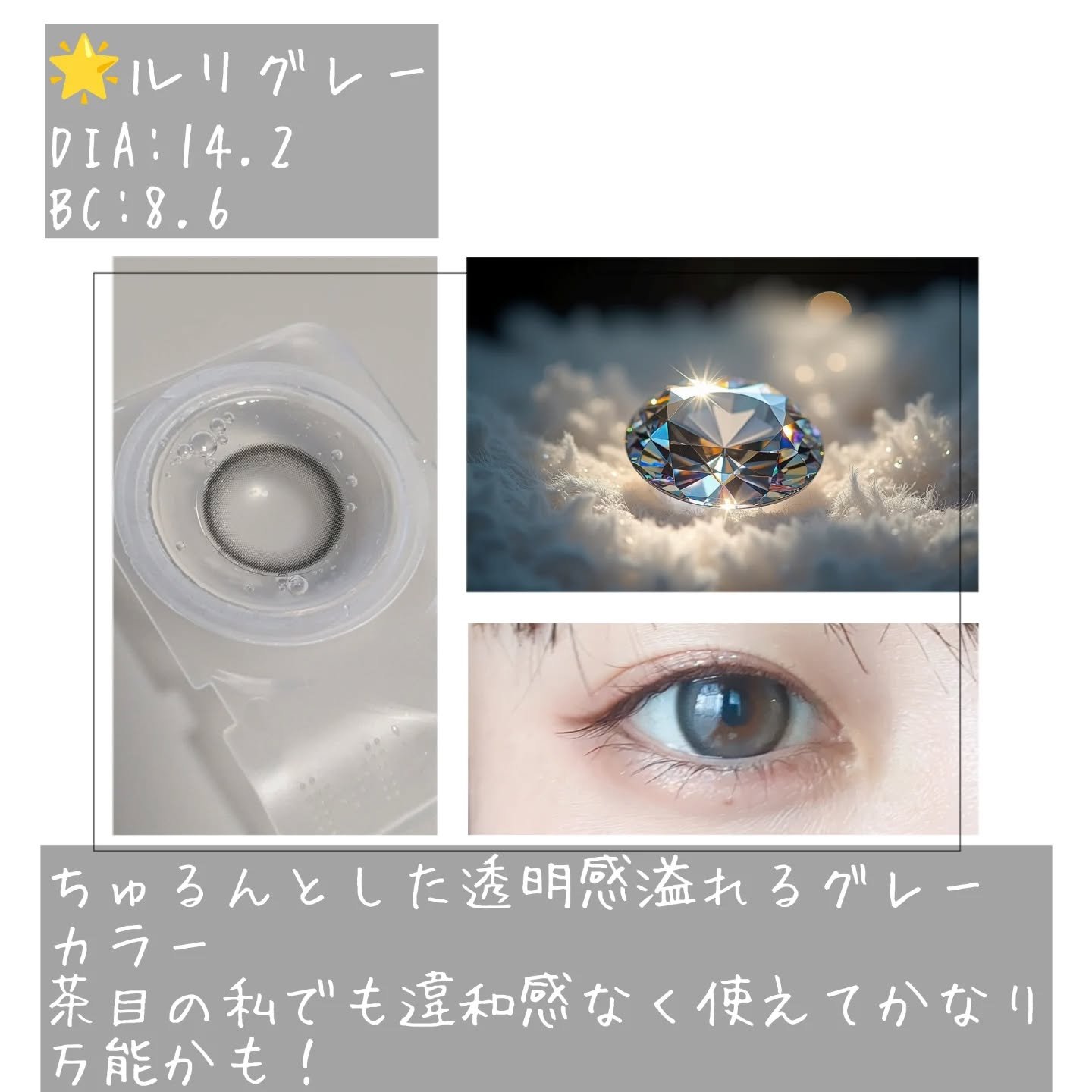 ANGÉLIQUEDIA>>>>14.2mm着色直径>>>>13.3mm(ルリグレー)、13.2mm(サラングレージュ)BC>>>>8.6mm使用期間>>>>ワンデー含水率>>>>38.5%i-dleSOYEON(ソヨン)ちゃんがイメー...