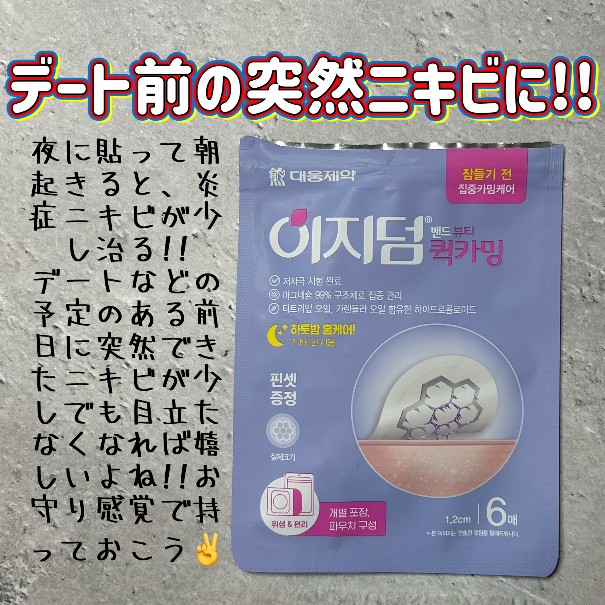 韓国の大手製薬会社『大熊製薬』が開発した話題のニキビパッチ! ニキビの状態に合わせて4種類から選べます。 クイックカーミング(紫)×リアルカーミング(ピンク) 1日で素早くニキビを鎮静させたい時におすすめな組み合わせ! 朝パッチを剥がした時には赤みが引いて ニキビが気にならないくらいまで落ち着いた◎