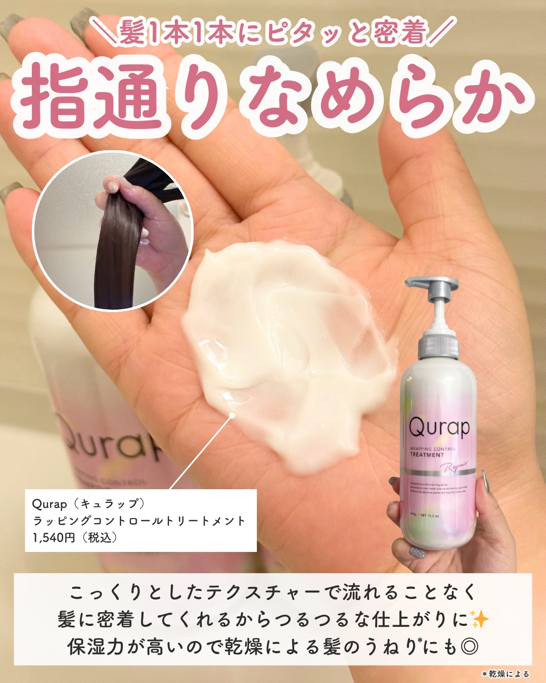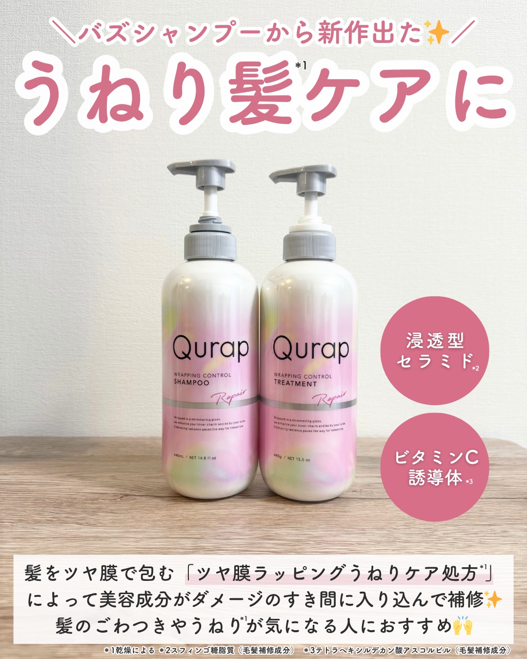 Qurapさまより頂きました🌟.ツヤ膜ラッピング処方でうるおい密封🫧☺️🩷.Qurapから新しい発売された⚪︎ラッピングコントロールシャンプー・トリートメント各1,540円(税込).髪のCMCに着目した浸透型セラミド*1×ビタミンC誘導体*2...