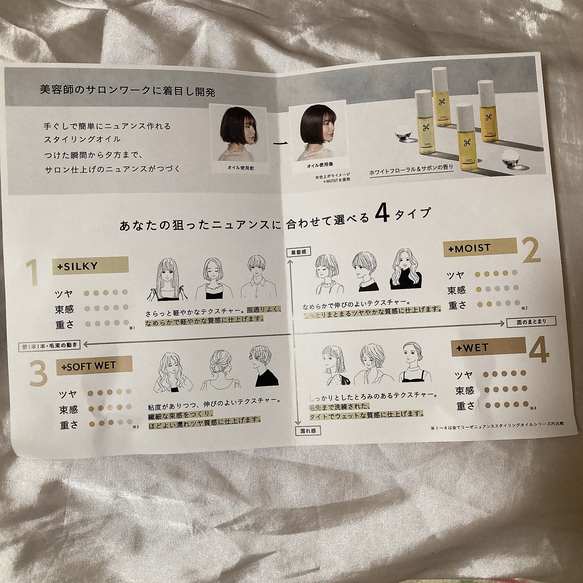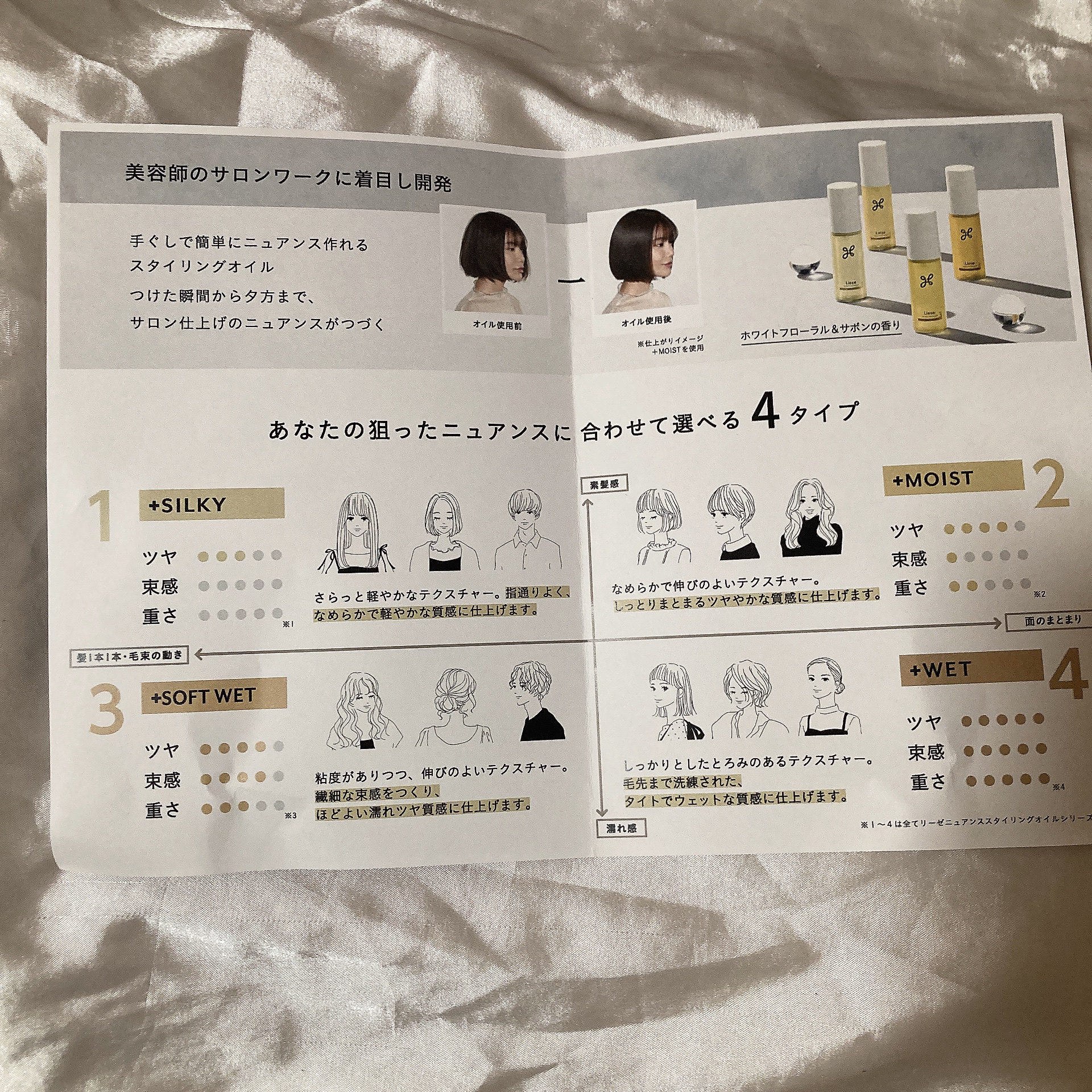 シルキー、モイスト、ソフトウェット、ウェットの4種類展開のヘアオイル🫧 保湿成分としてホホバオイルなどが配合されています✨ 程よくまとまりもいい3番がお気に入りです🥰