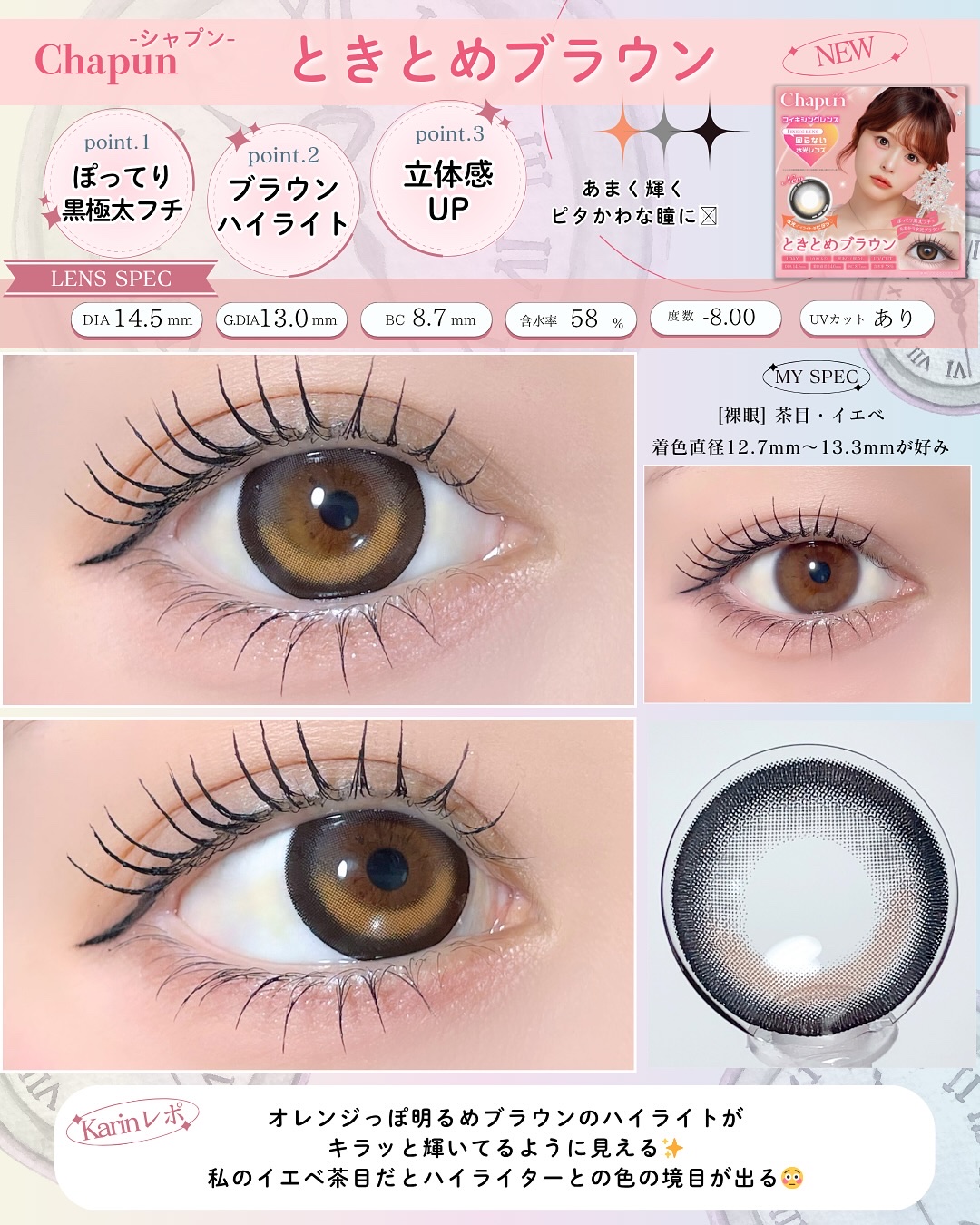 - 齊藤なぎさイメージモデル 可愛いを諦めないちょっぴり小悪魔な女の子たちに向けたカラコンブランド ■華奢フチ×透明感ブラック いとおしブラック DIA:15.0mm 着色直径:14.1mm ゆらめき黒グラデと華奢フチで小悪魔級に盛れちゃううるみレンズ♡ ■くっきり細フチ×きらめきブラウン きらゆめブラウン DIA:14.5mm 着色直径:14.0mm くっきり細フチときらめくちゅるんブラウンであどけなさあふれる ばぶみレンズ♡ ■太フチ×モテ盛れベージュ ずるモテベージュ DIA:15.0mm 着色直径:14.5mm 黒太フチと白っぽベージュでつくる夢中にさせちゃうずるモテレンズ♡ ■ぽってり黒太フチ×うるキラ水光グレー ときとめグレー うるみきらめくピタかわな瞳に♡ DIA:14.5mm 着色直径:14.0mm じんわり滲む極太フチとうるっと光るしずくグレーのカワイイ続く回らない盛れ水光レンズ♡ ■ぽってり黒太フチ×あまキラ水光ブラウン ときとめブラウン あまく輝くピタかわな瞳に♡ DIA:14.5mm 着色直径:14.0mm じんわり滲む極太フチとキラッと光る甘あまブラウンのカワイイ続く回らない盛れ水光レンズ♡ ■細フチ×メルティーグレージュ ぬけがけグレージュ DIA:14.5mm 着色直径:13.8mm 儚げカワイイ細フチとメルティーグレージュでみんなが振り向くぬけがけレンズ♡ カラーコンタクトレンズの不適正使用による眼障害の危険性等などがあります。 ●コンタクトレンズは高度管理医療機器です。不十分な洗浄・消毒など不適切なケアや、長時間・交換期間を超えた装用により、アレルギー性結膜炎、角膜感染症、角膜潰瘍等の重篤な眼障害が発生する危険性があります ●ご使用前に取扱説明書を確認してください 使用上の留意事項 ●眼科医院等を受診してからお求めください ●眼に異常を感じたら直ちにレンズ使用を中止し、お近くの眼科等で診察を受けてください ●医師の指示にしたがってご使用ください ●コンタクトレンズを装用する場合、自覚症状がなくても、眼科医院等での定期検査を受けてください ●レンズに不具合がある場合は使用しないでください