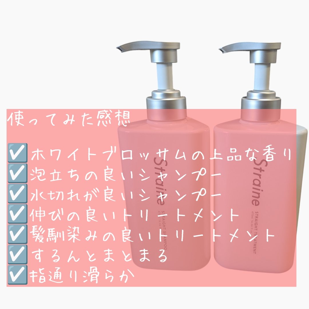 Straineストレートシャンプー/ストレートトリートメント髪内部のうねり原因を補修してストレートヘアを目指すシャンプー&トリートメント✨上から見ると三角形のデザインシャンプーはさらっとしたテクスチャー泡立ちは良くて...