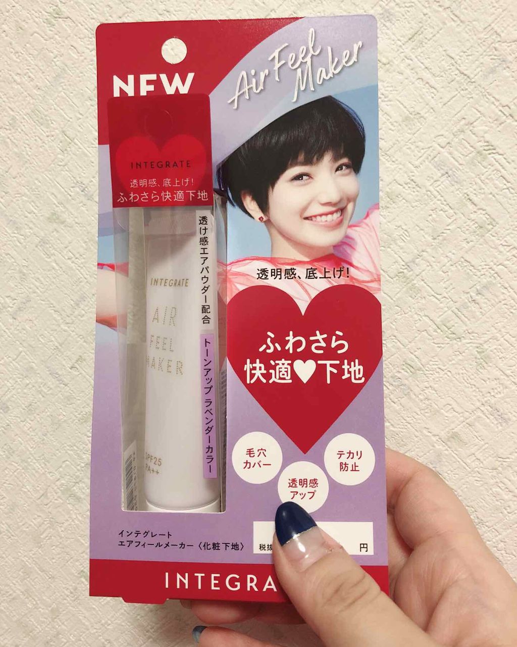 インテグレートのエアフィールメーカーラベンダーカラーをクチコミ!!!テカリ防止用に以前購入←整理していたら出てきた!⭐️特長⭐️〇さらさらして、テカリを防いでくれる→混合肌のTゾーンでも少し乾燥するけど💦〇日焼け止め効果あり→SPF25,PA...